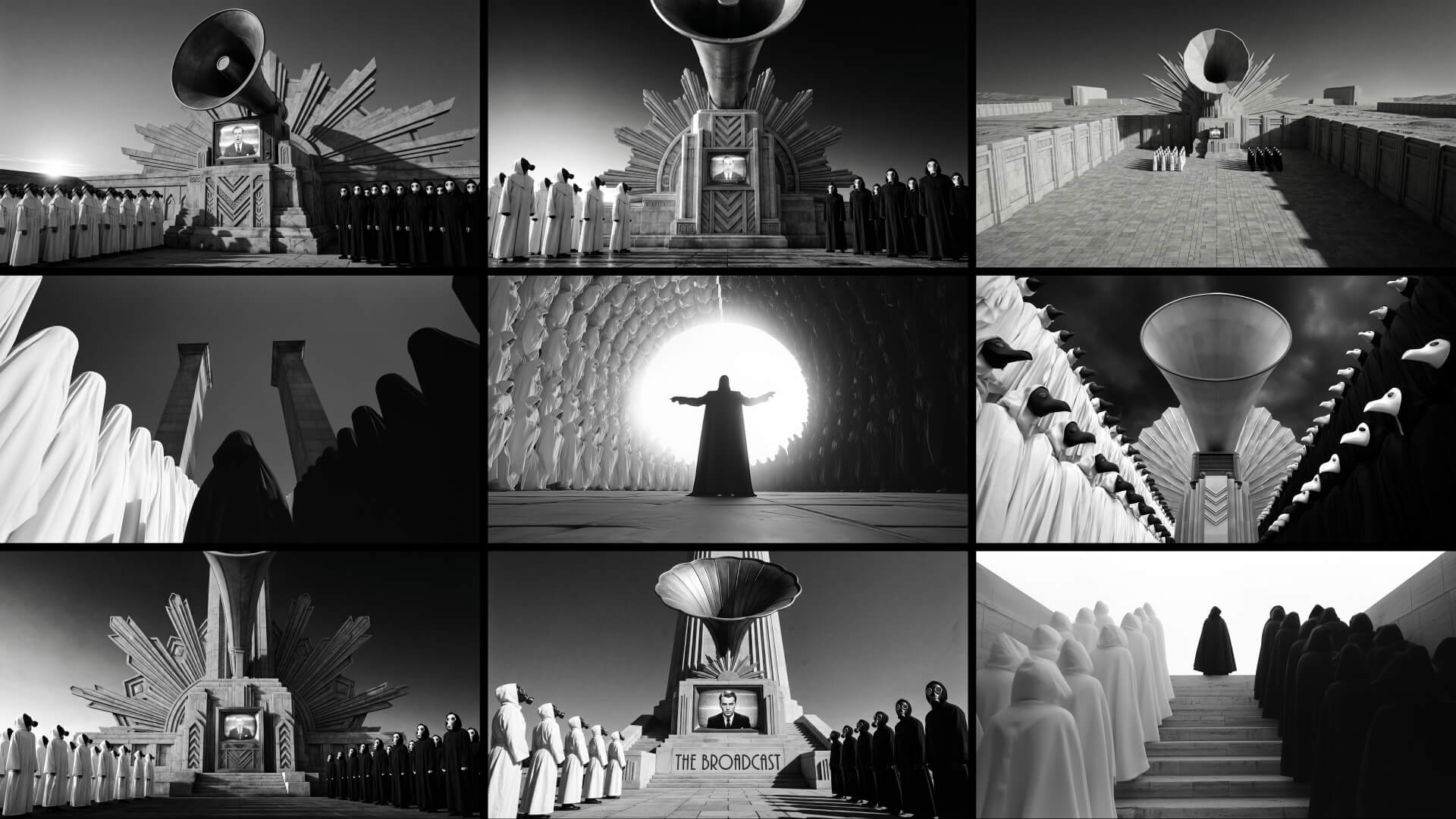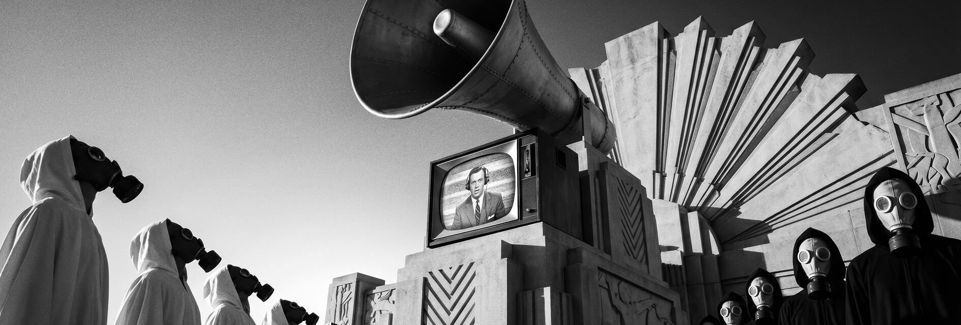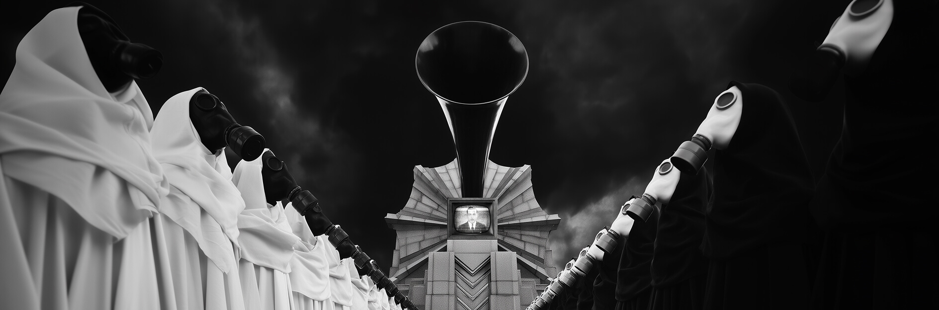 Die Bilder von Manufactured Consent zeigen Figuren in Schwarz und Weiß, in Gewändern, die an Rituale erinnern. Sie wenden sich einem Objekt zu, das sendet – nicht empfängt. Kein Dialog. Nur Richtung.