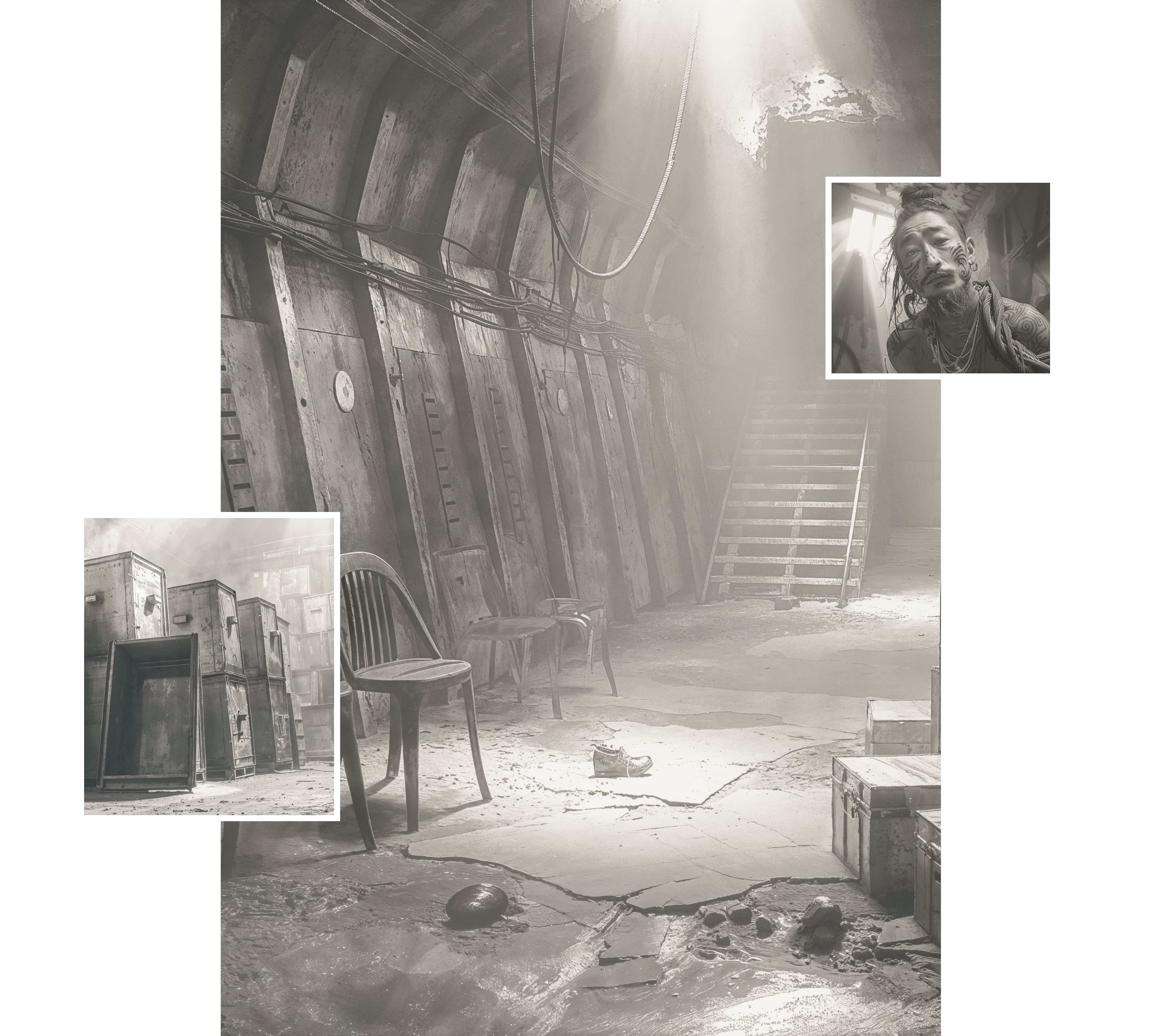 All life above the earth’s surface has been eradicated. An endless sea of sand and rubble spreads out, while the sky glows an unnatural gray, streaked with fine dust particles that have settled in the atmosphere.