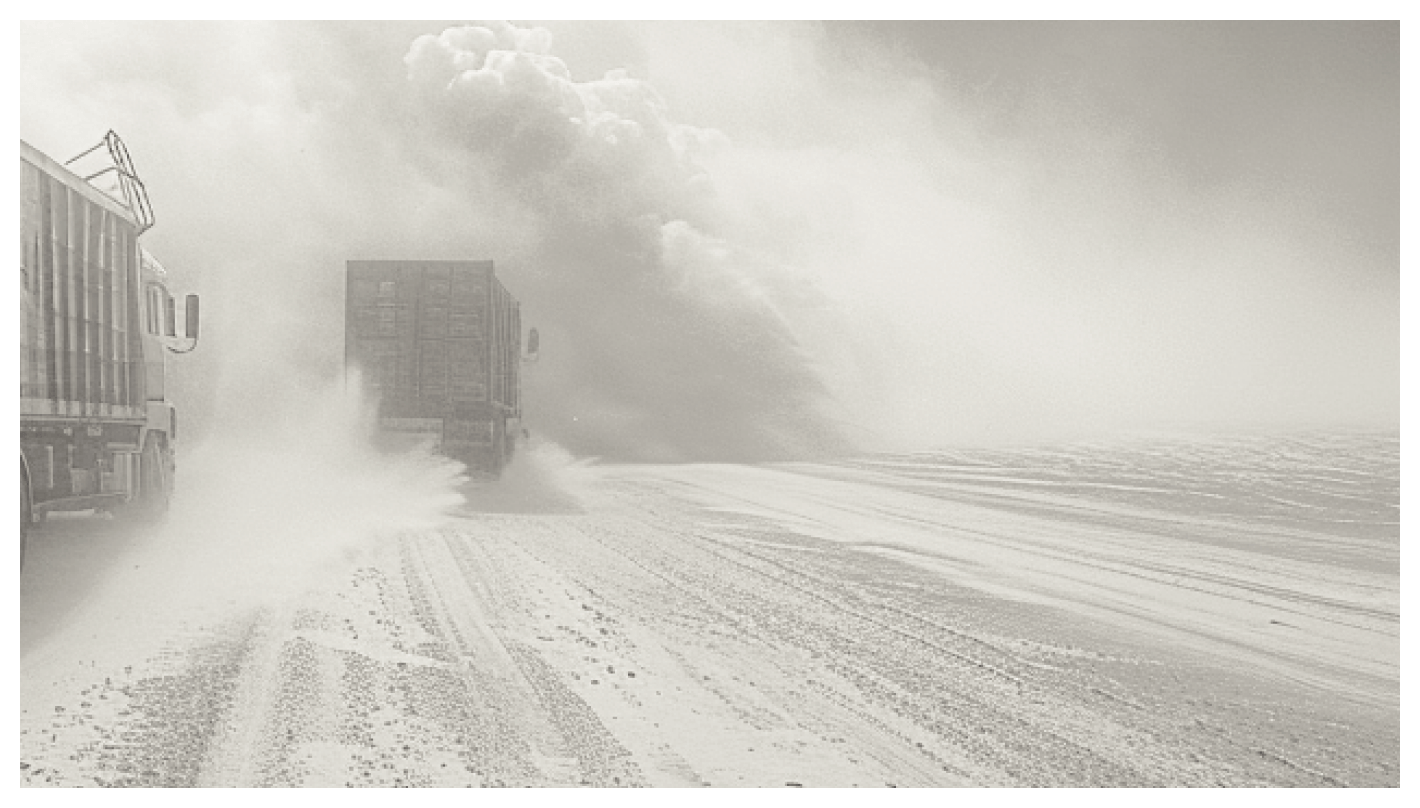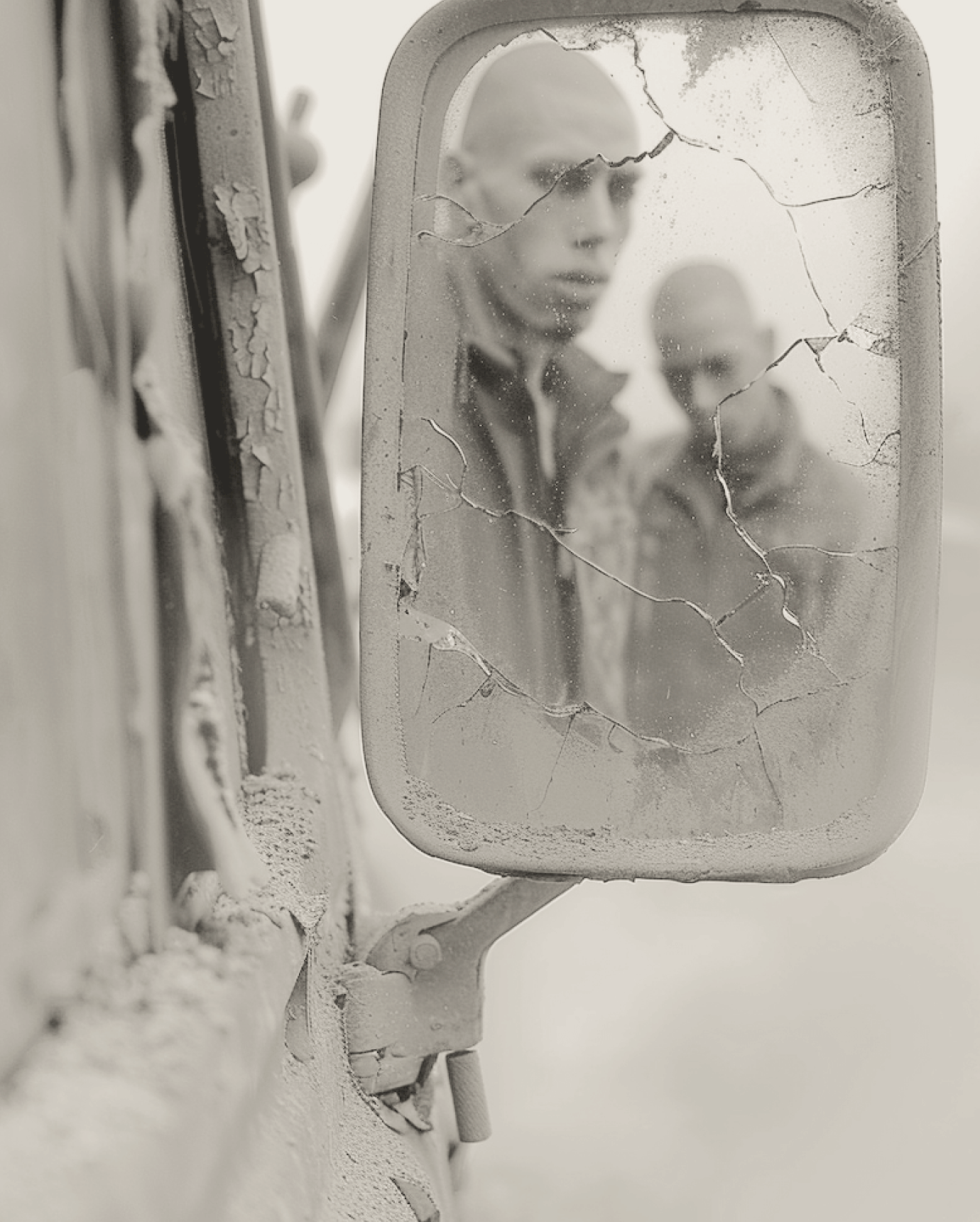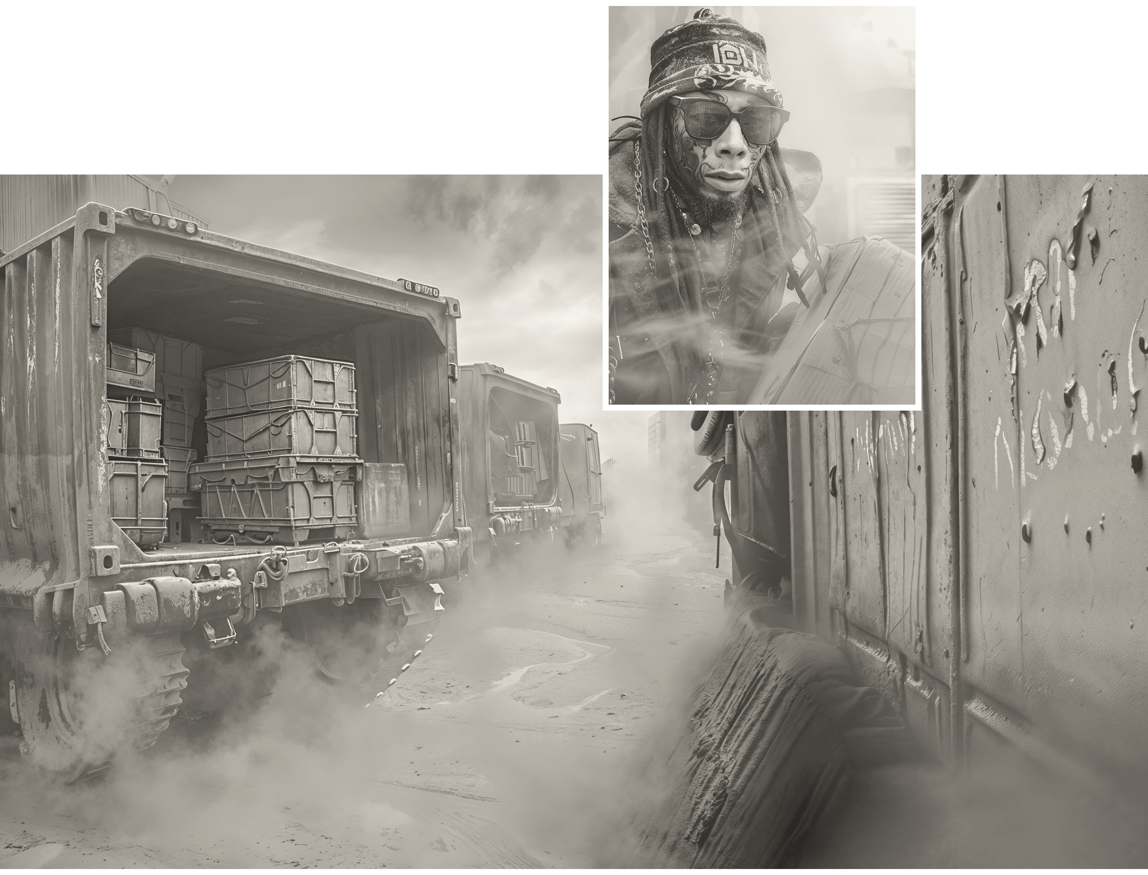 Broken shipping containers lie like stranded whales along the encrusted coast, their once-imposing hulls corroded by rust and time. These relics of past trade routes and prosperous times now stand as mute witnesses to the apocalypse. We drive on, past dilapidated houses, their windows staring empty-eyed into the void.