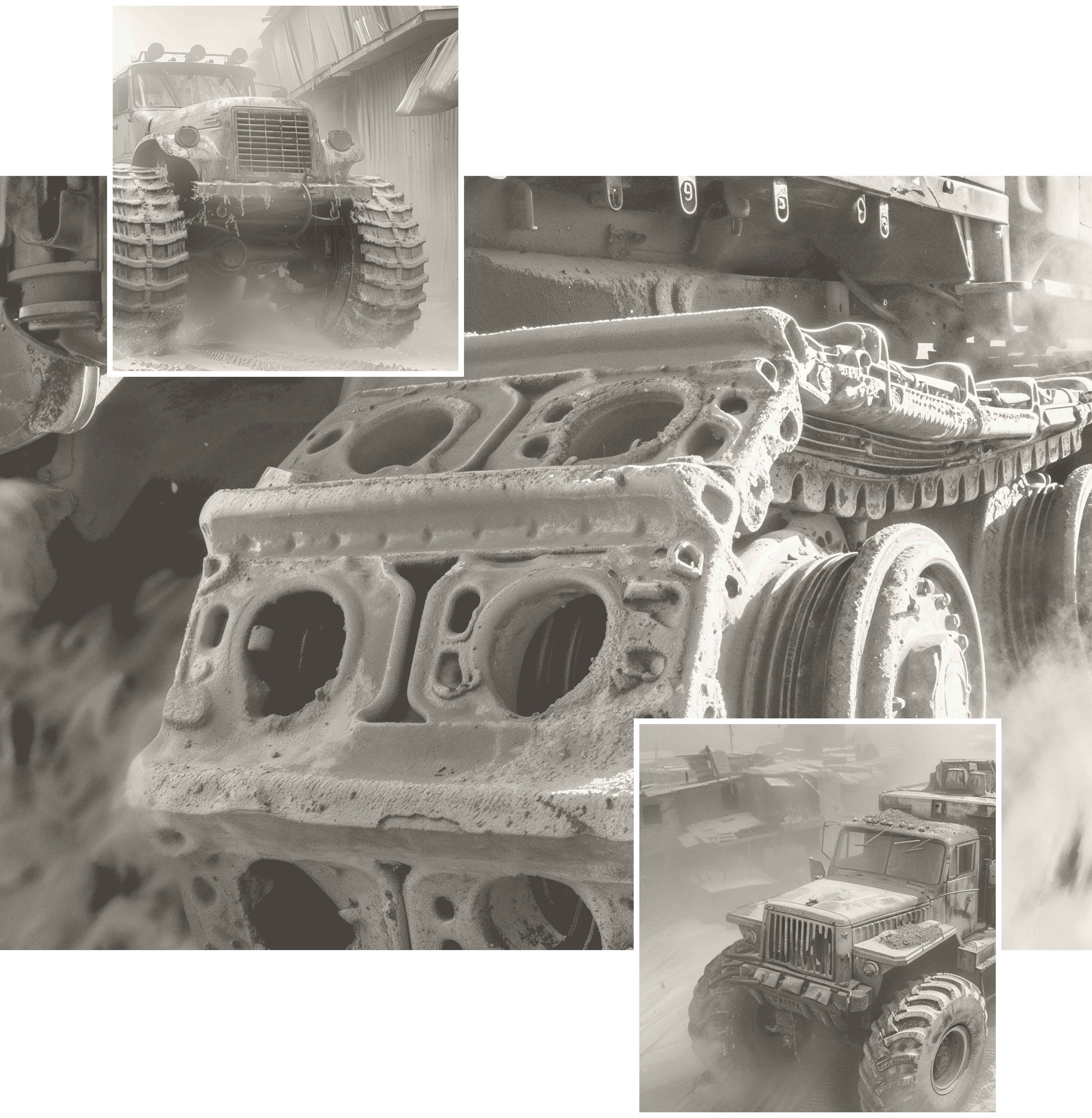 Our tracked vehicles, massive machines resembling monstrous beetles, stand ready. Their tracks dig deep into the sandy ground, as if they were alive and hungry for the upcoming journey through the merciless landscape.