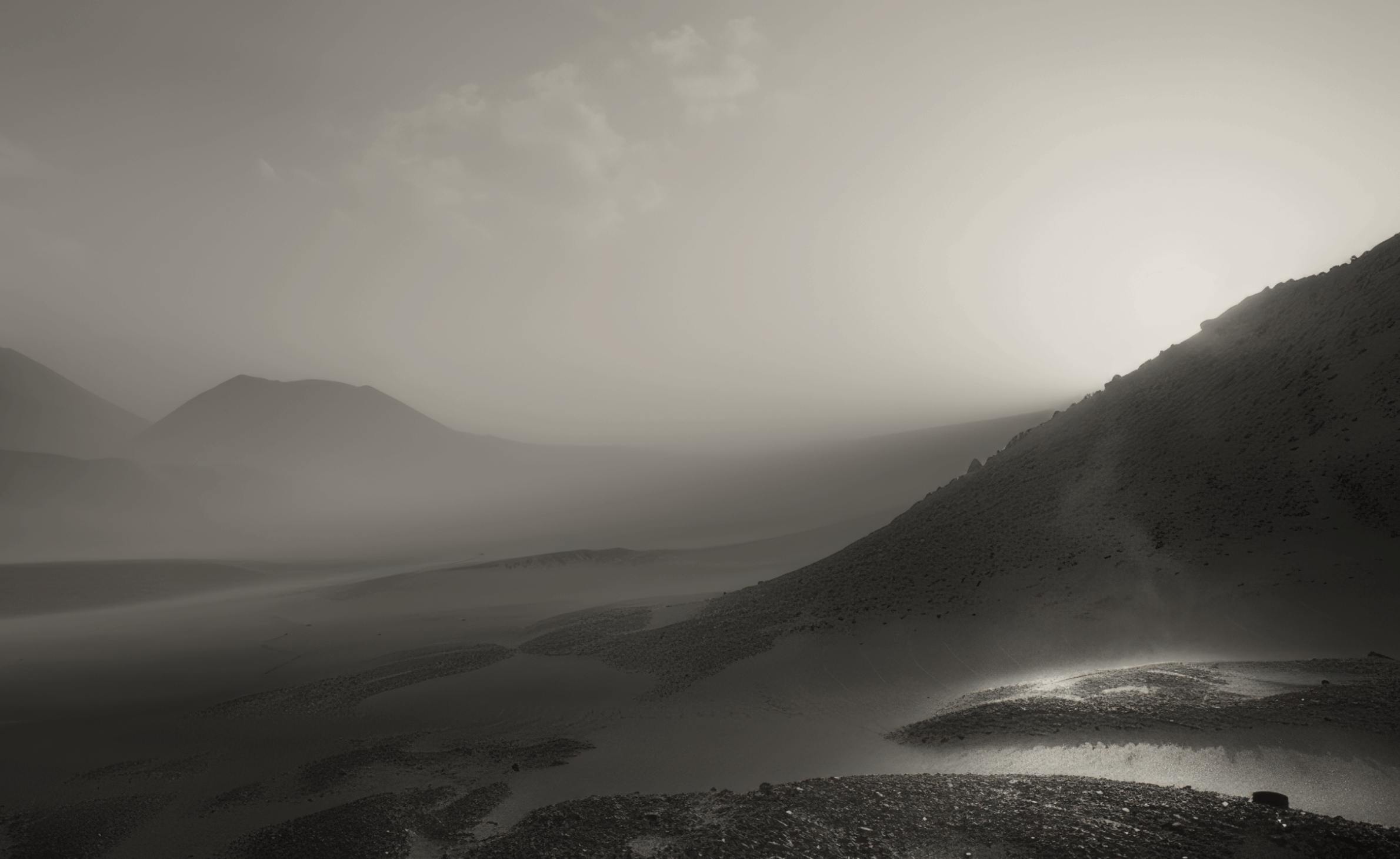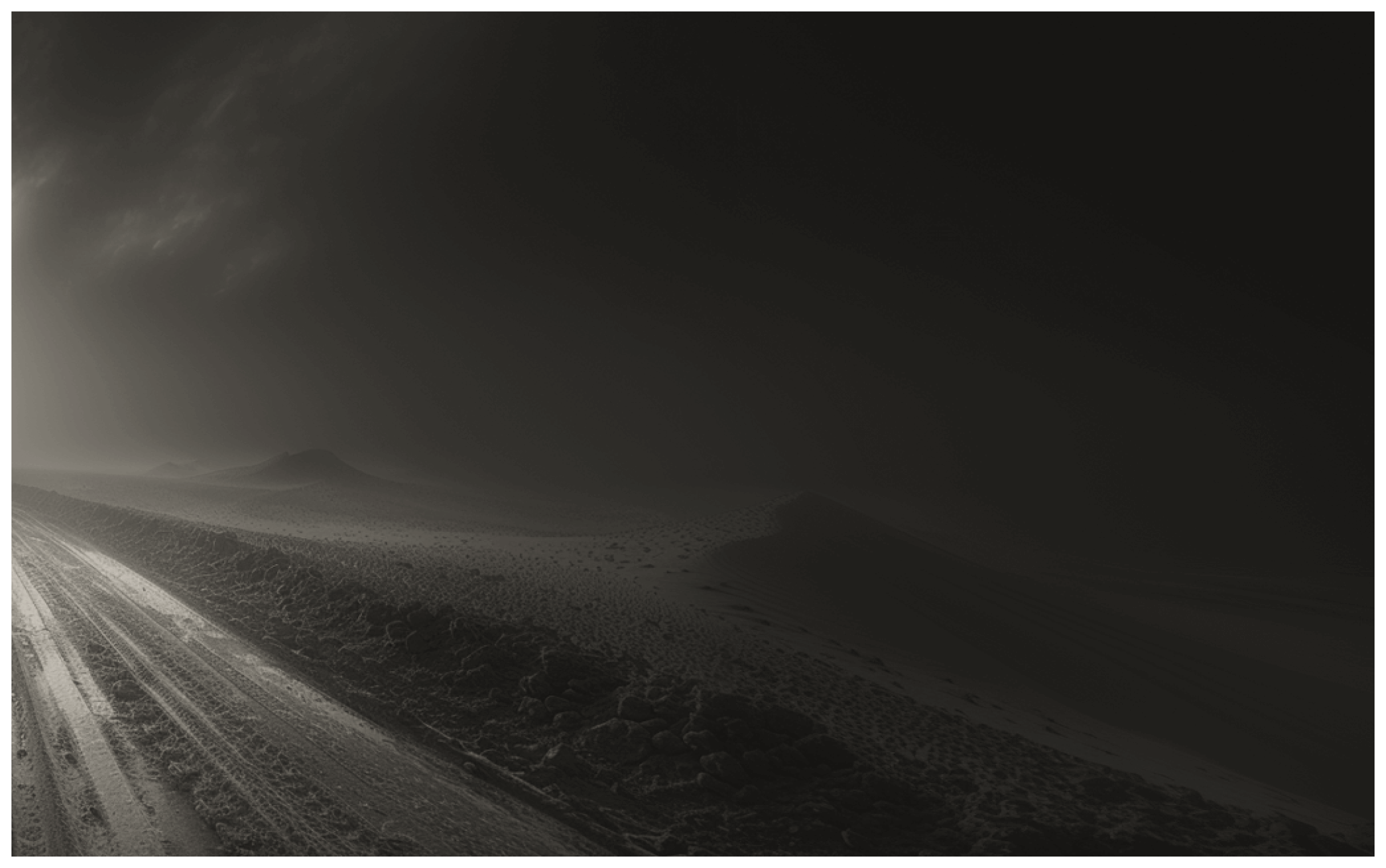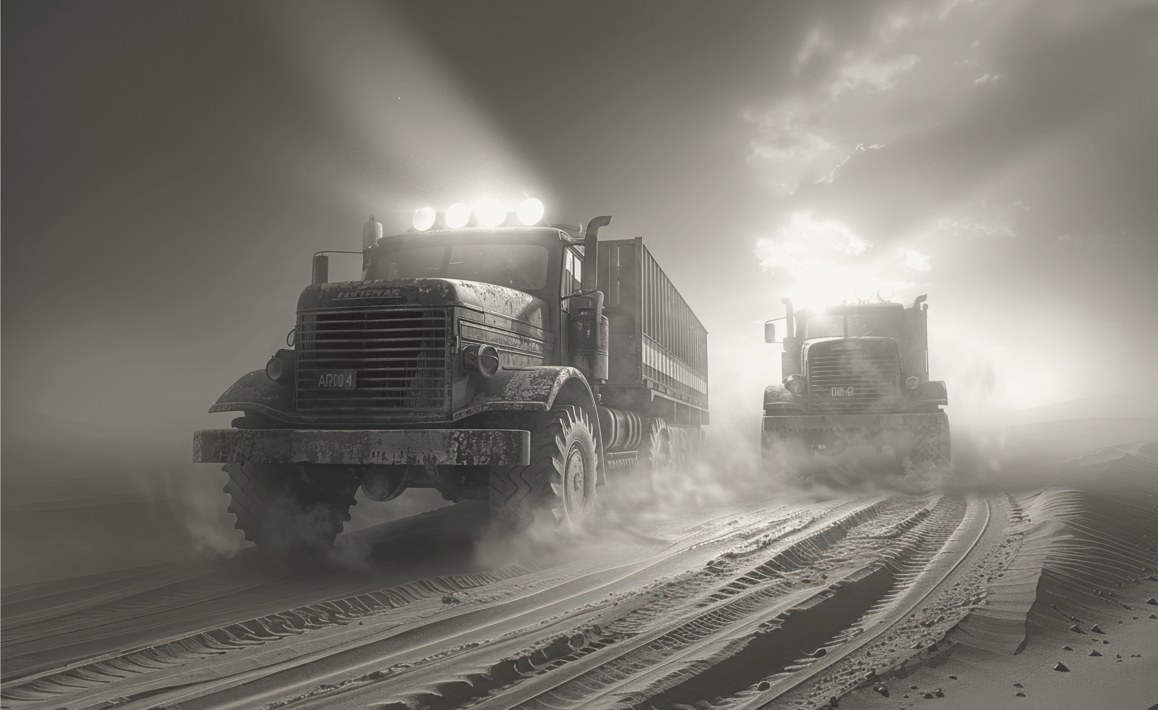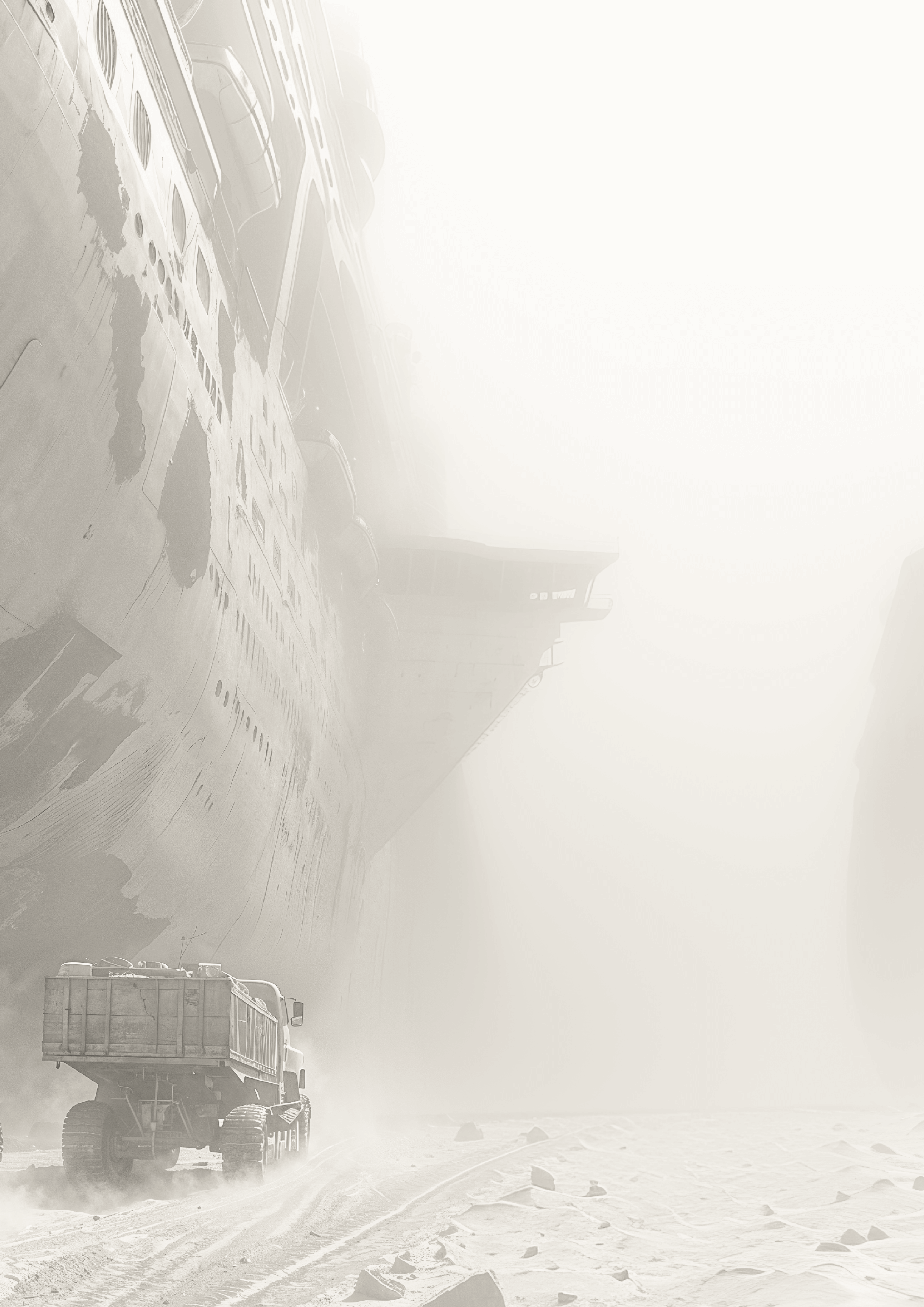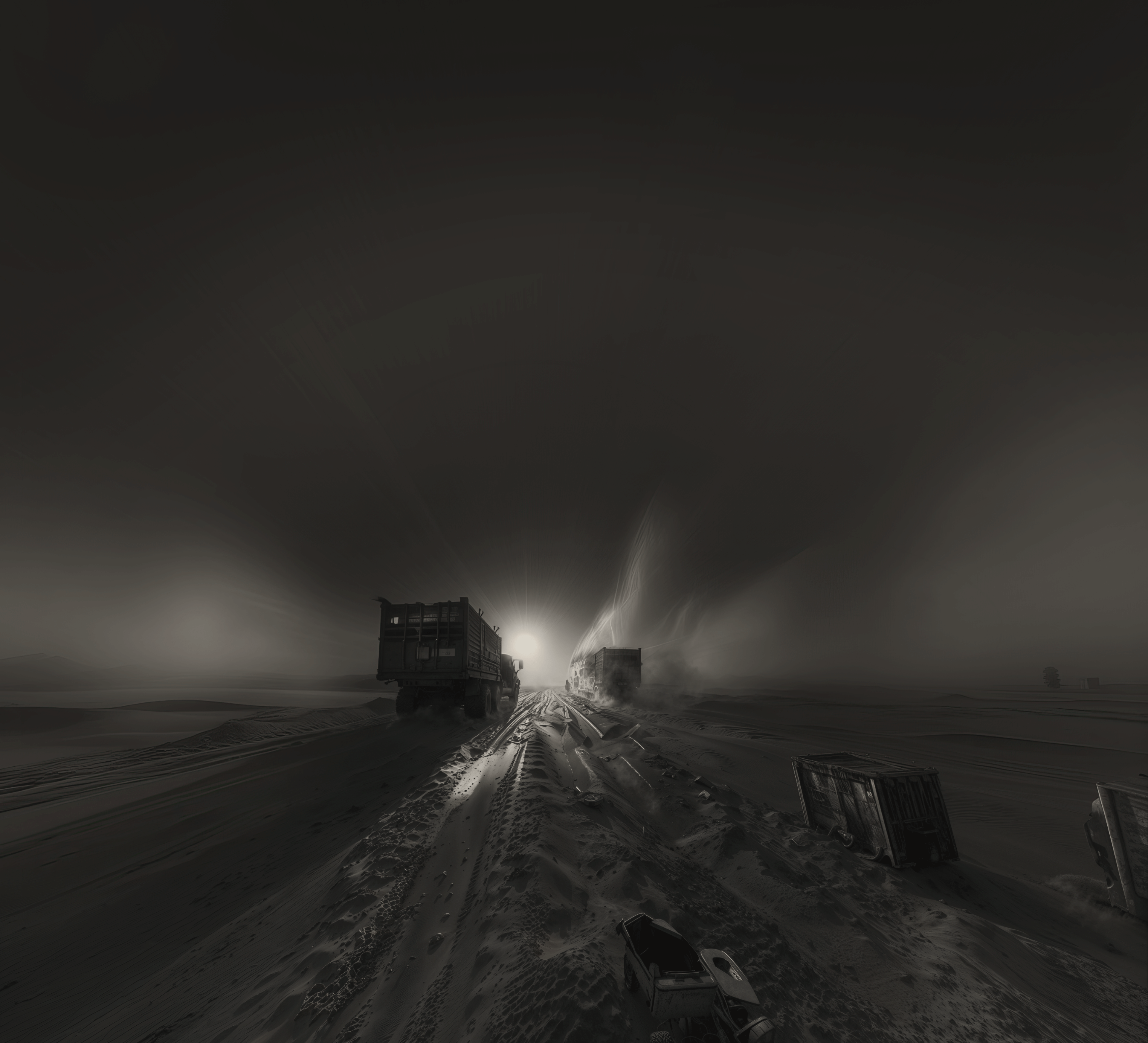 The sun begins to set. The vehicles plow through the sand, leaving our trail behind. Night falls, and we continue our journey, accompanied by the eerie silence of the Earth’s surface. I can feel the weight of the challenges ahead in every movement of the tracks beneath us.