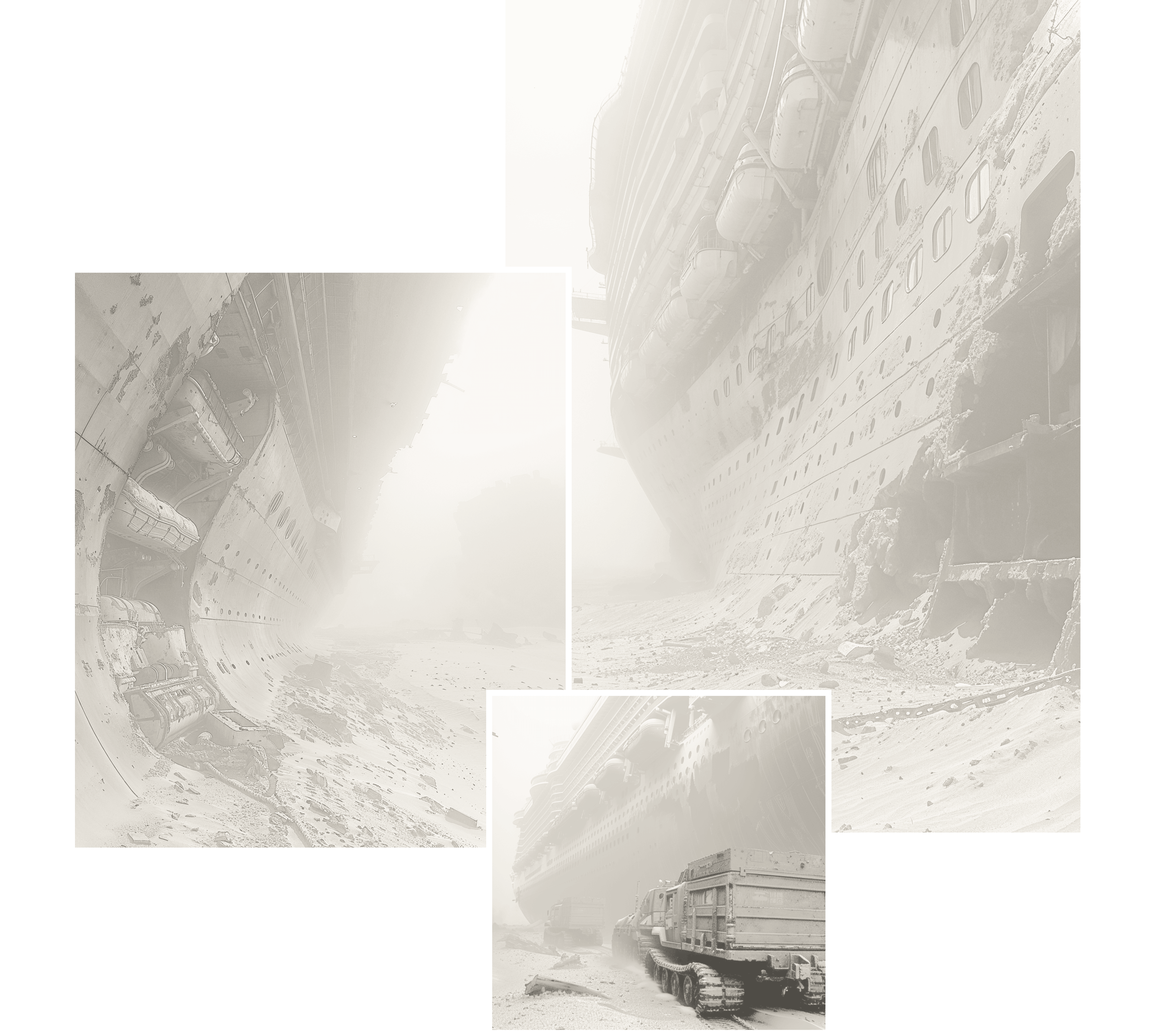 But what truly catches the eye are the gigantic remnants of the former luxury cruise ships lining the trail. These once-majestic behemoths, symbols of wealth and exclusivity, now lie like grotesque monuments of downfall in the desert; their sight is simply overwhelming.