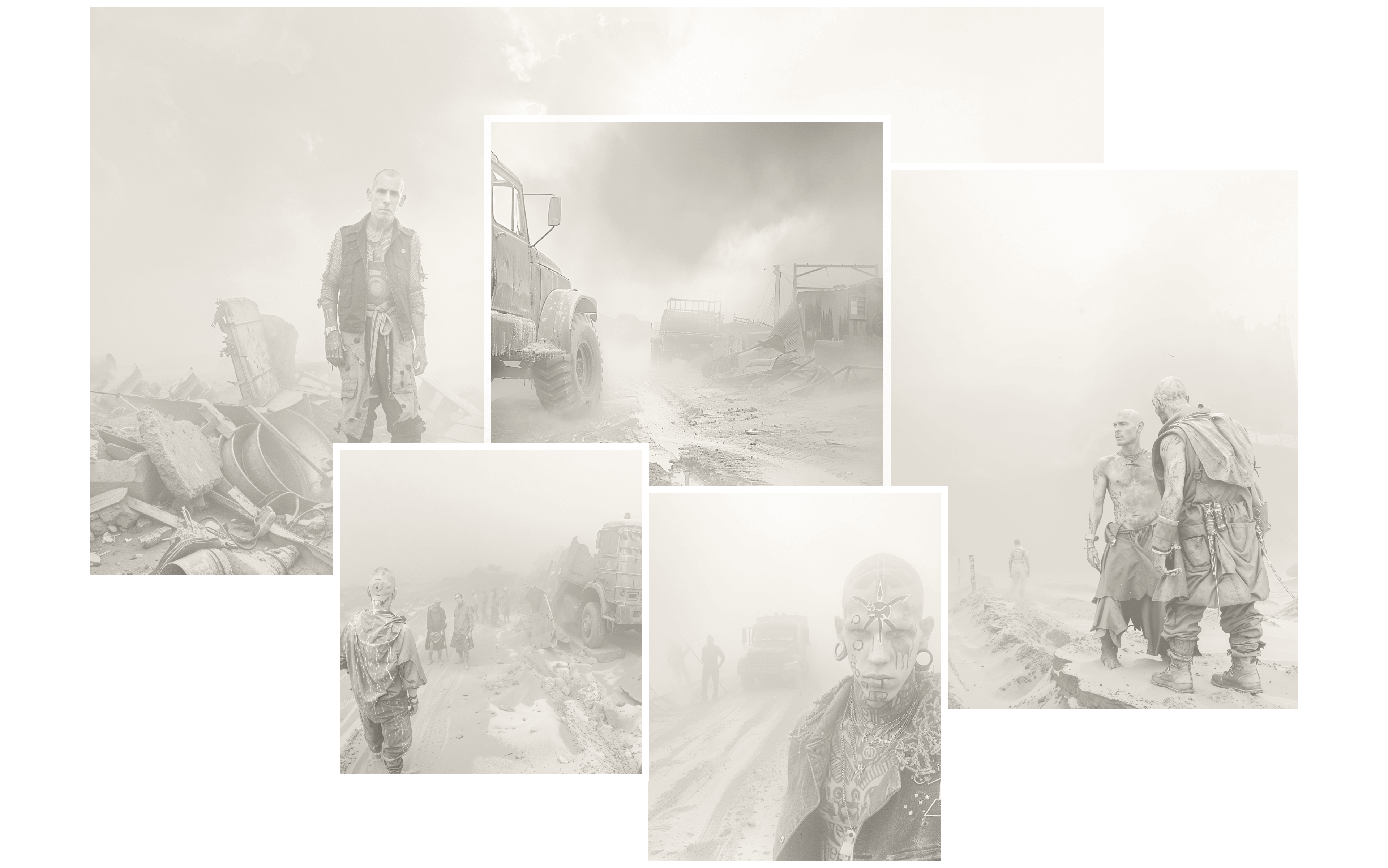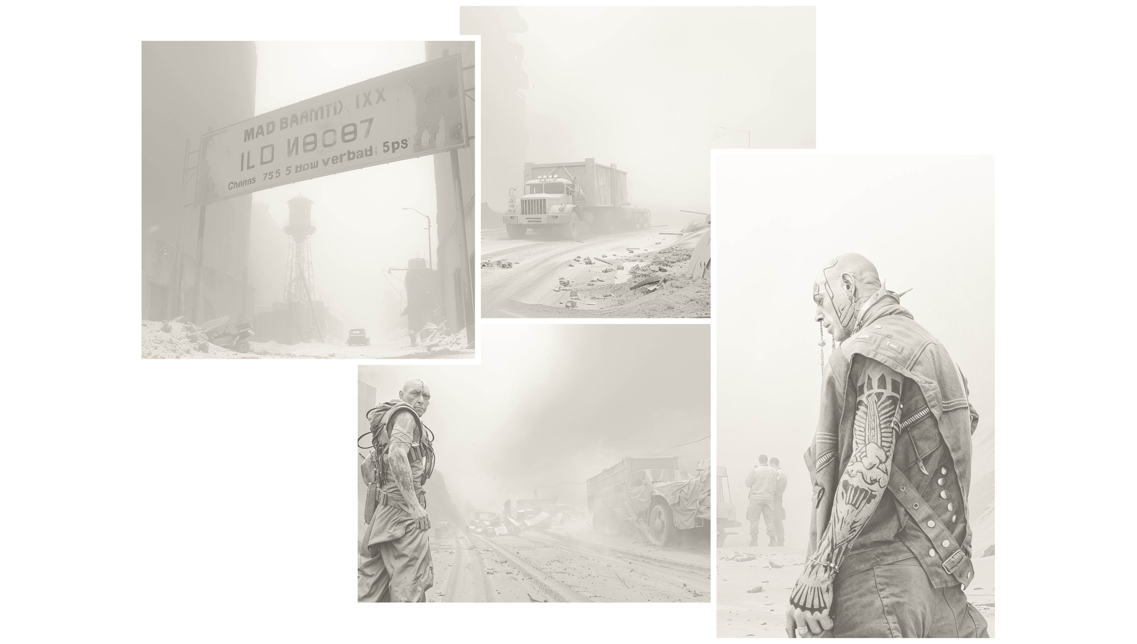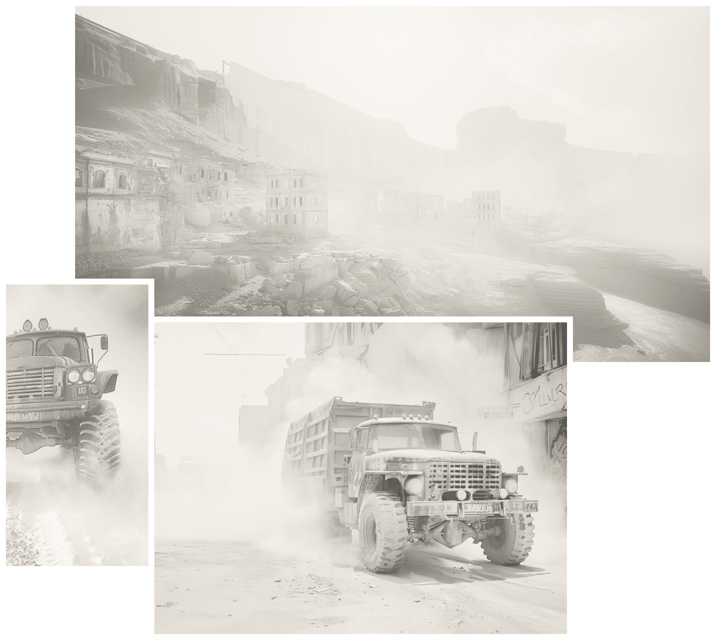 Our vehicles move through the crumbling suburbs, lined with debris and metal. The air is bone-dry, the light toxic. Everywhere, the traces of the catastrophe are visible. The streets are littered with debris and disintegrate into dusty paths, that are barely recognizable.