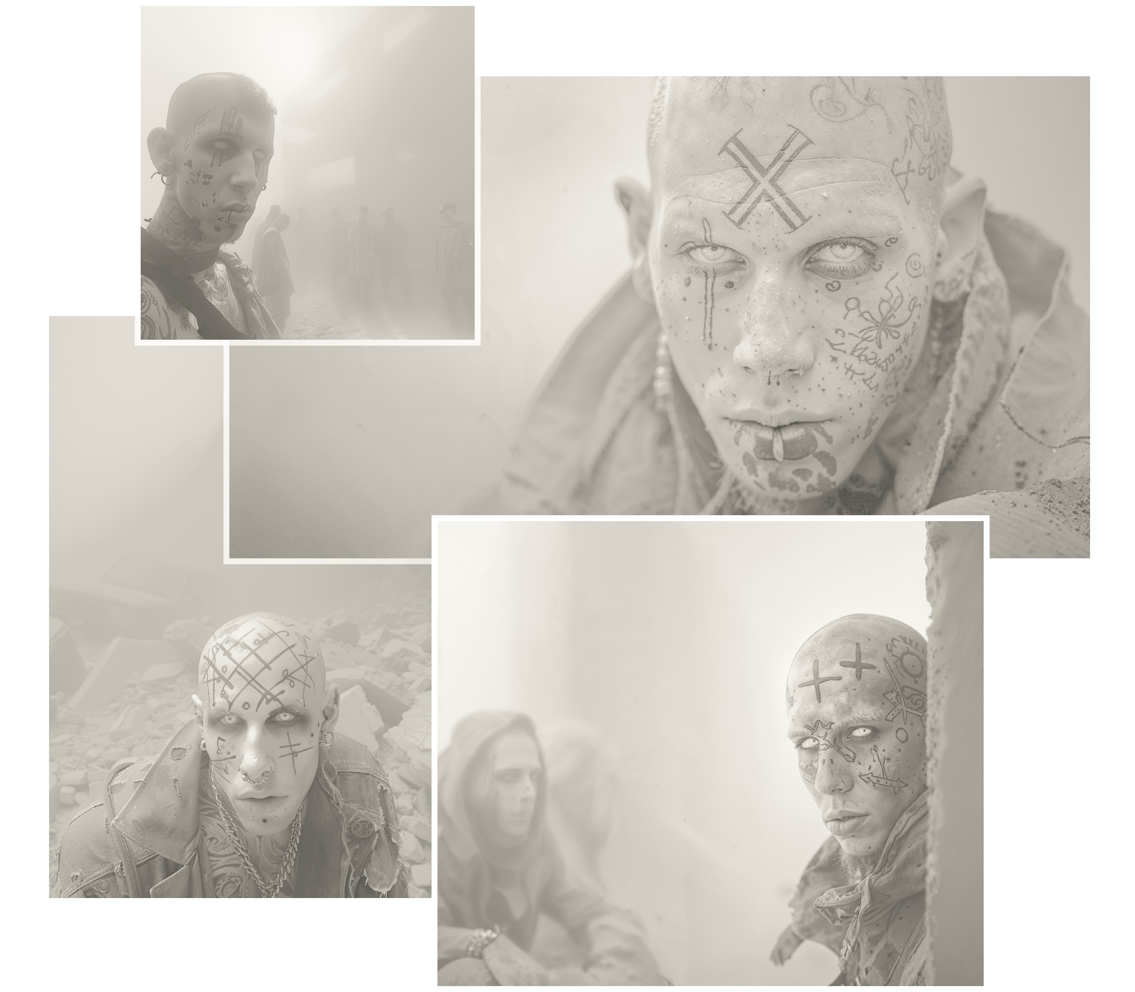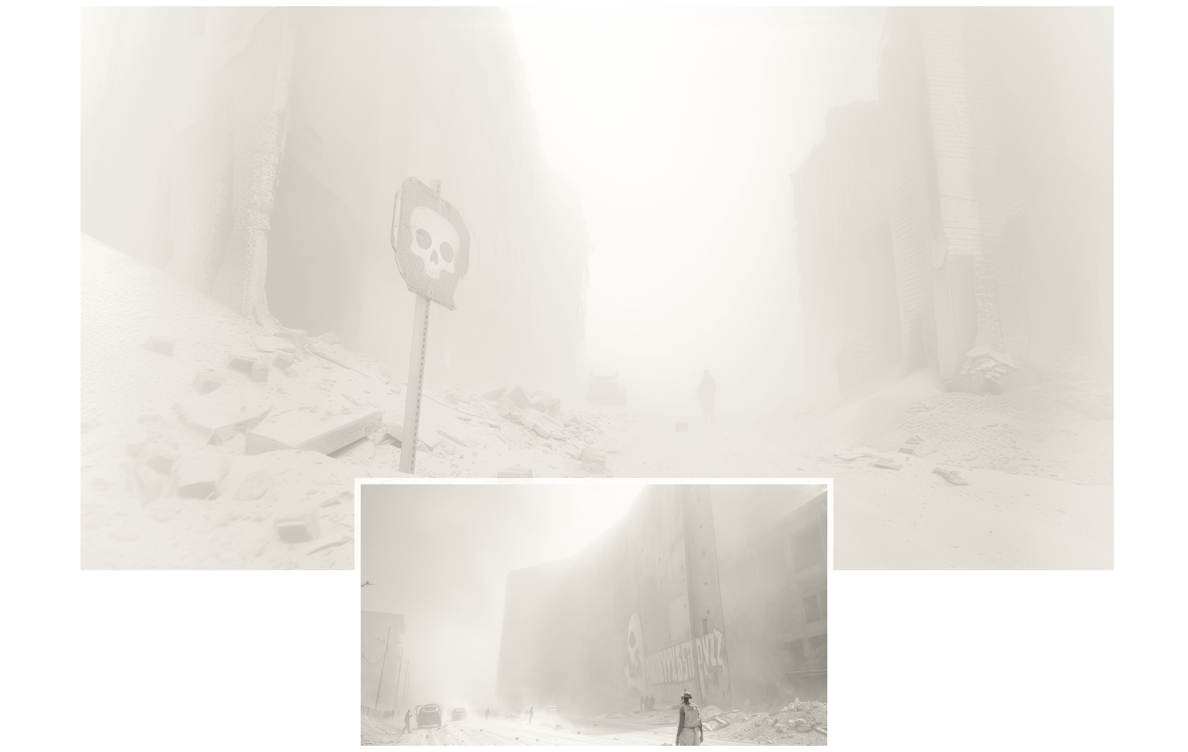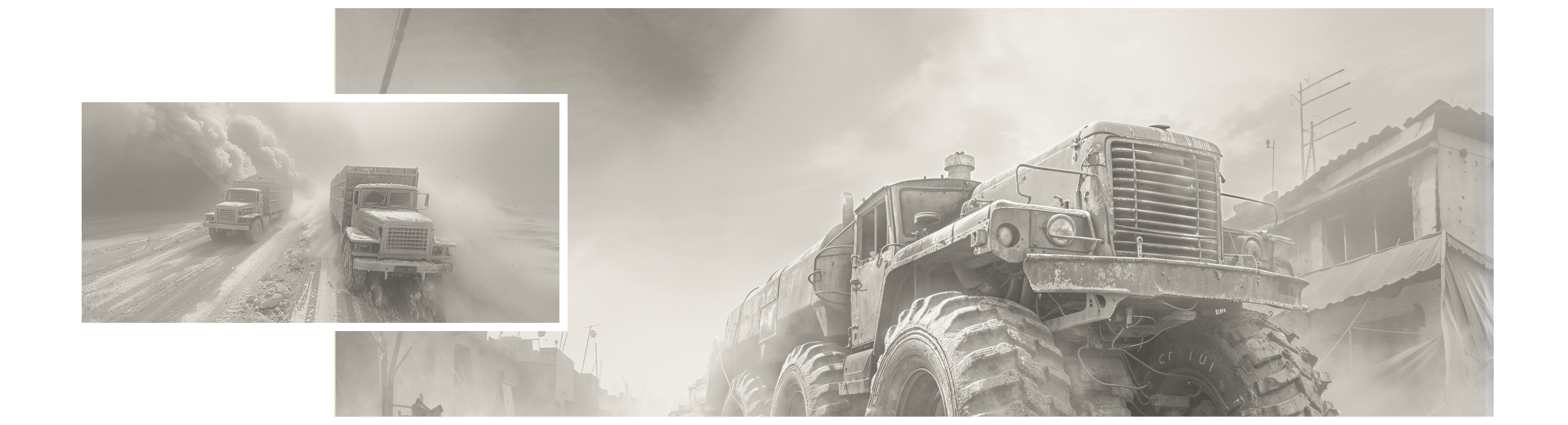 Our vehicles move through the crumbling suburbs, lined with debris and metal. The air is bone-dry, the light toxic. Everywhere, the traces of the catastrophe are visible. The streets are littered with debris and disintegrate into dusty paths, that are barely recognizable.