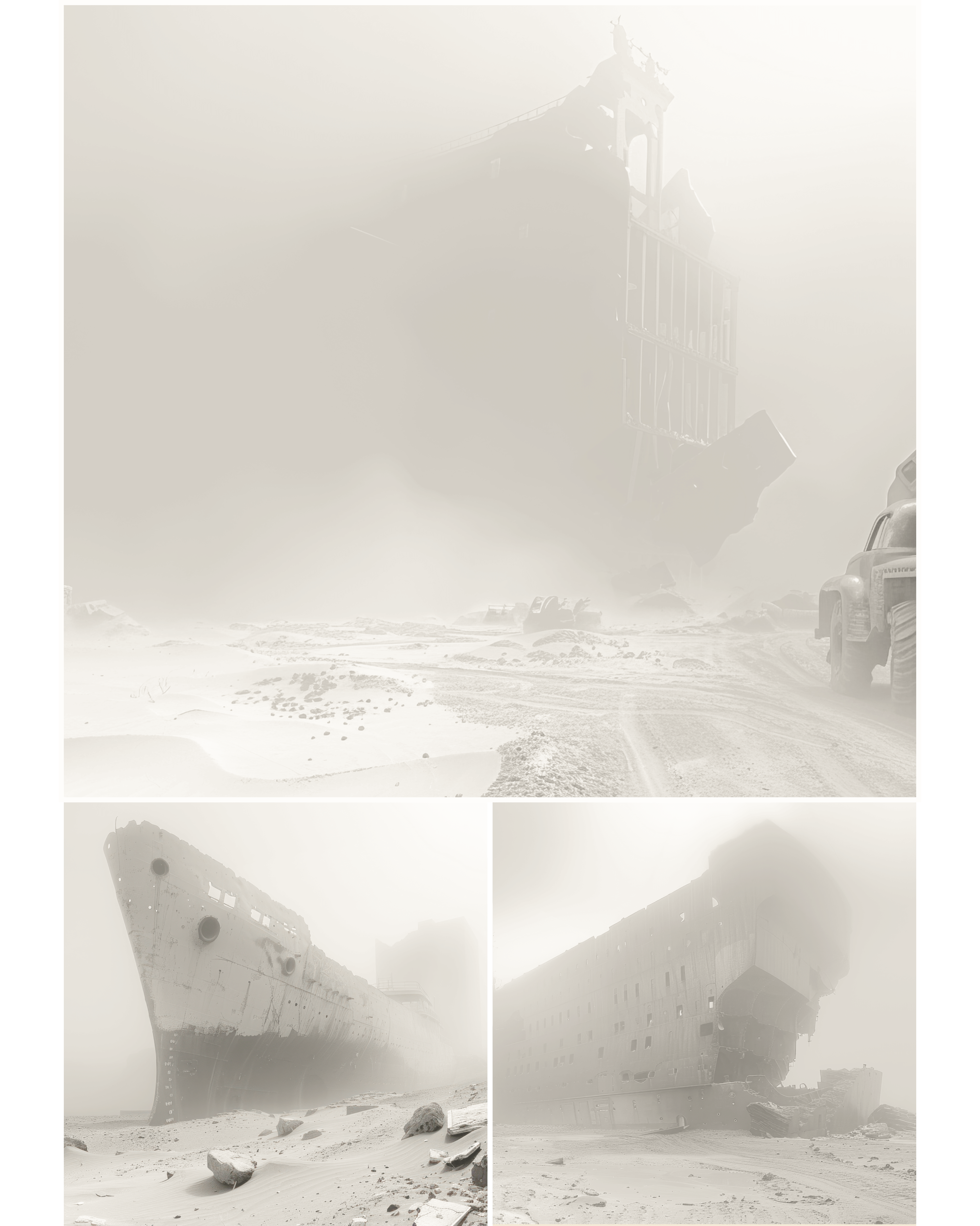 Noon. The scorching sun stands high in the sky, casting the decaying remains of Nouadhibou in a dull light. The place lies before us like a rotting carcass, a symbol of the decay and destruction that humanity has brought upon itself.