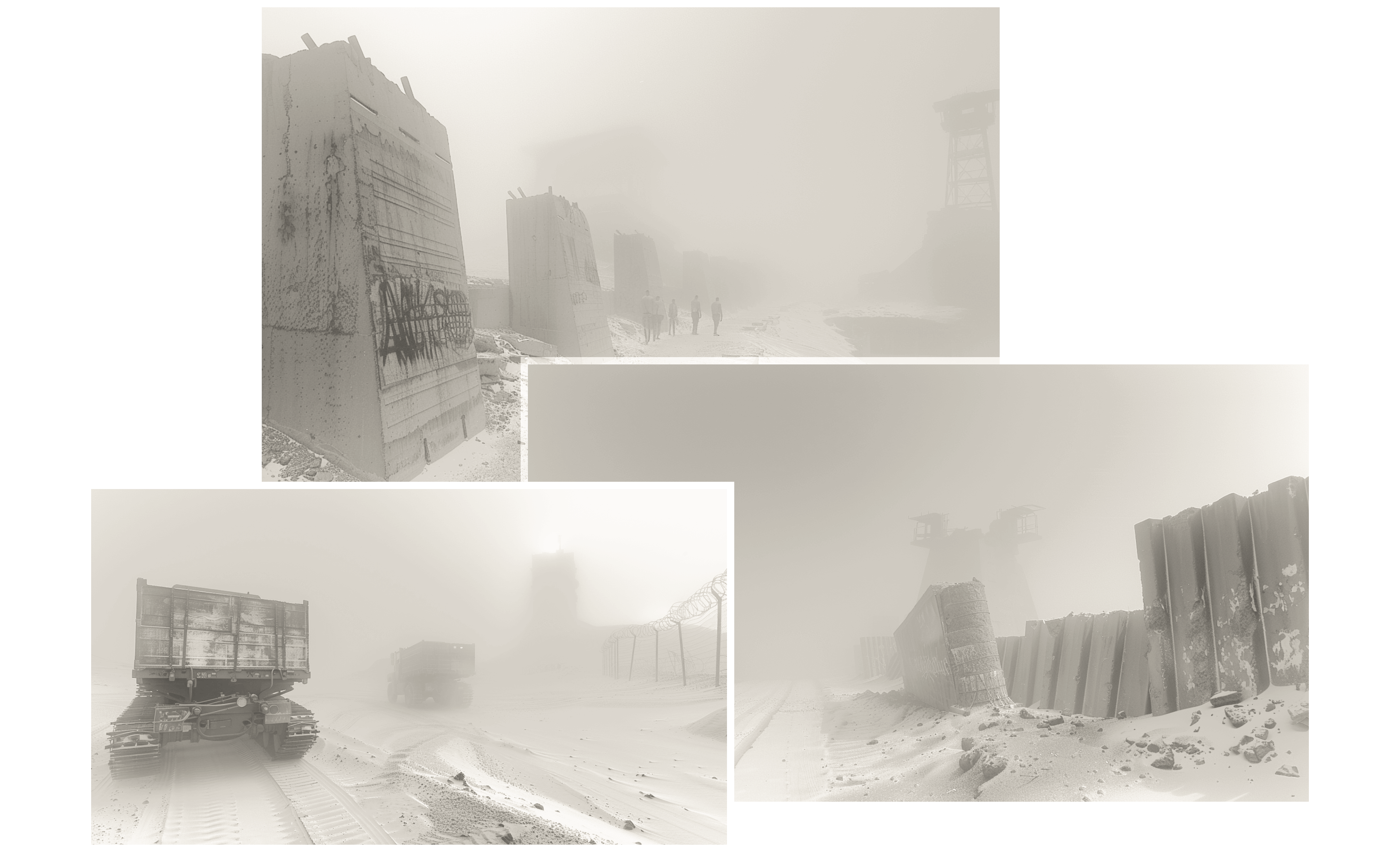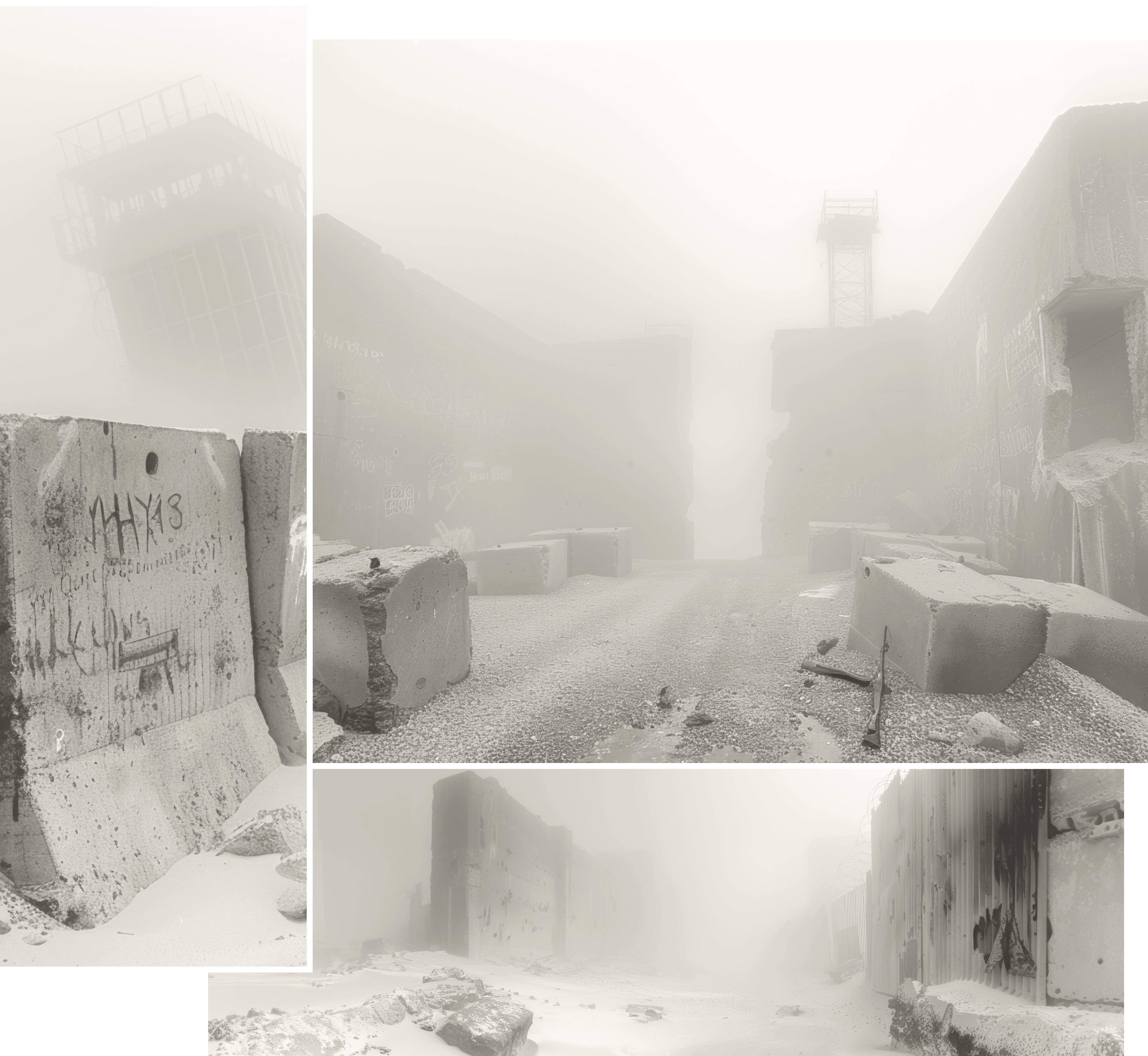 The border post stretches over a decayed landscape, where the remnants of a once-impressive military structure stand. Tall, rusty metal fences topped with barbed wire surround the area, while heavy concrete barricades block access. Abandoned watchtowers, some partially collapsed, stand like silent sentinels along the route.