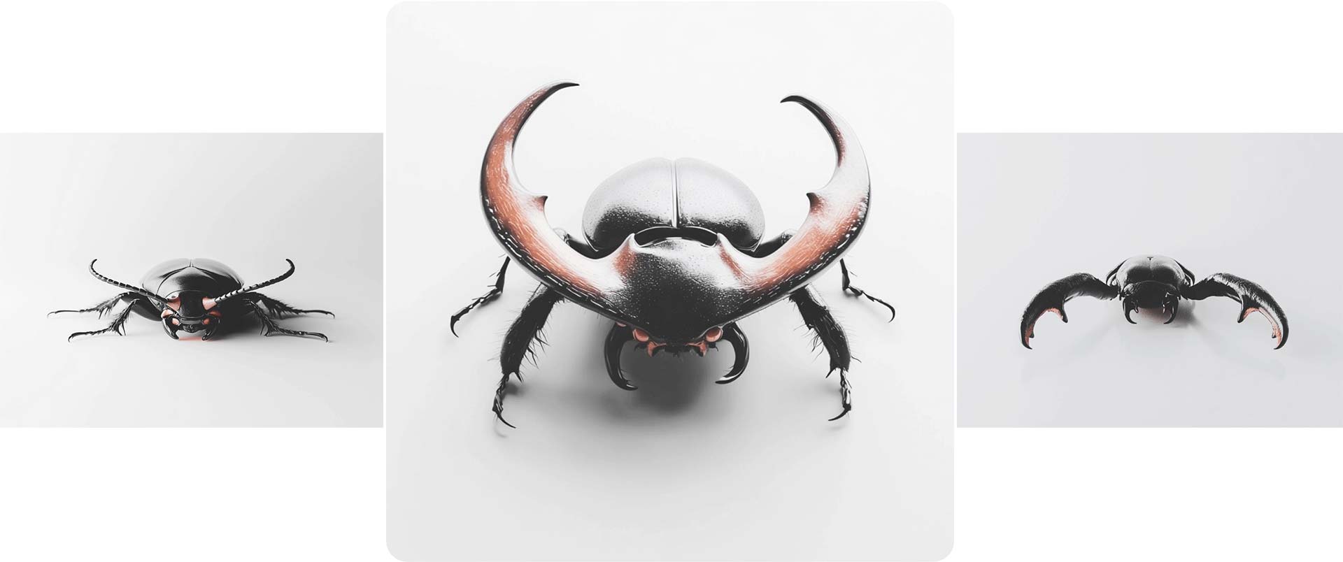 Die Käfer werden in einer präzisen, klaren Form dargestellt, die ihre natürlichen Konturen und Details betont. Die Hörner und Beinpaare sind scharf und detailliert ausgearbeitet. Die Frontperspektiven betonen die symmetrische Struktur der Käfer, während seitliche Ansichten den beinahe mechanischen Aufbau ihrer Körper betonen.