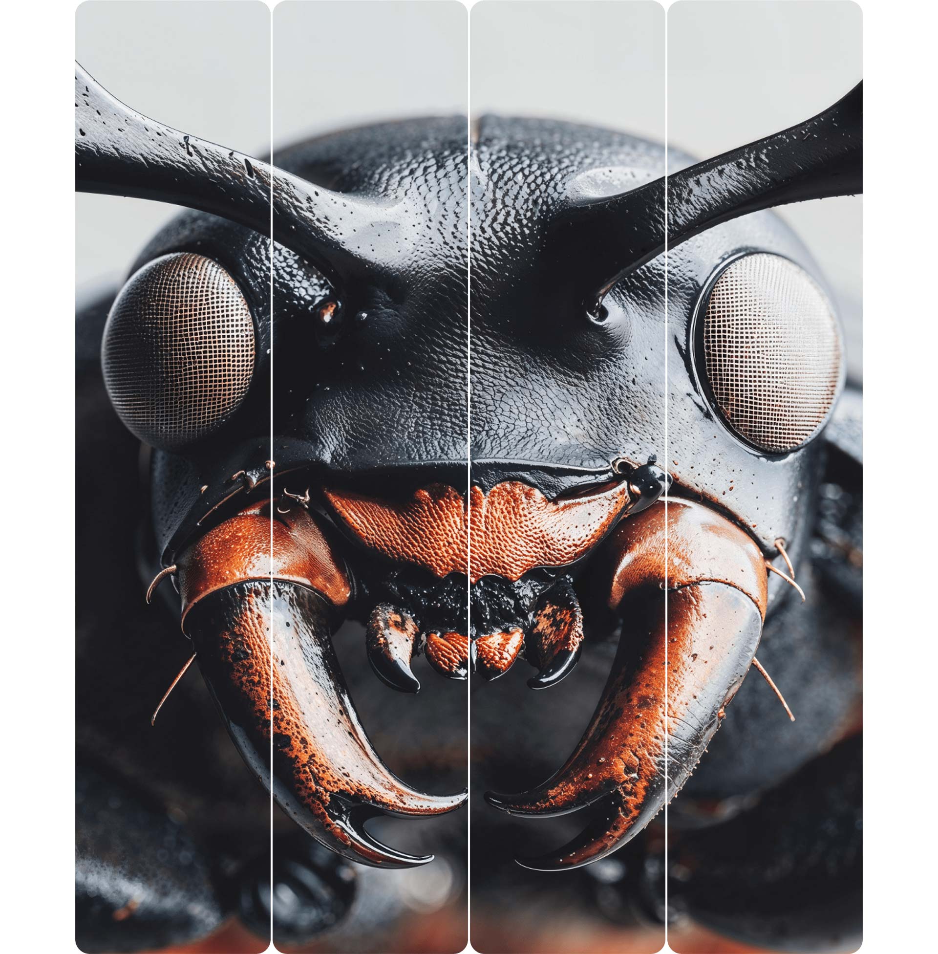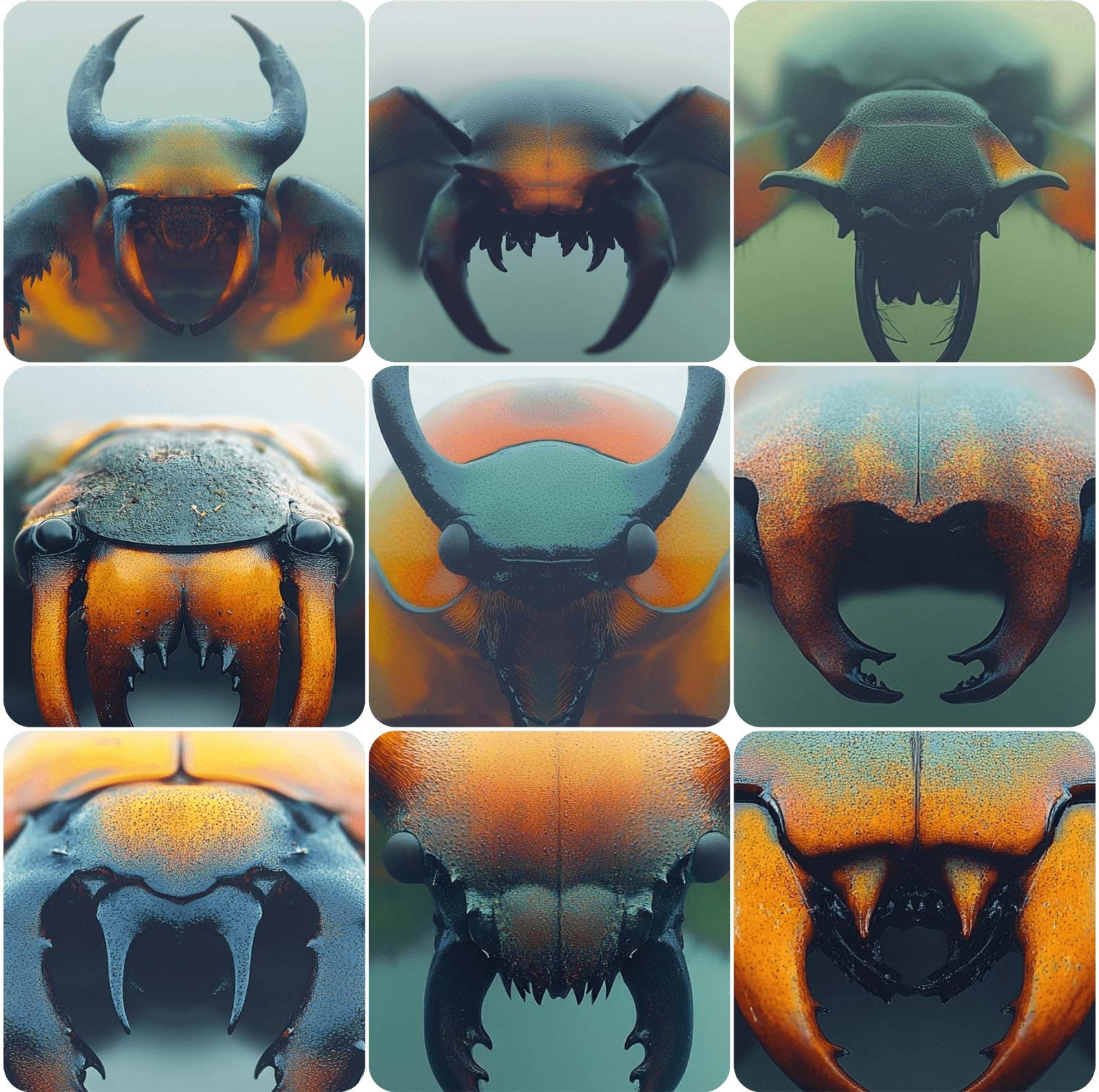 Die Gesichter der Käfer sind eindrucksvoll und faszinierend gestaltet. Ihre Augen wirken fast leuchtend und durchdringend. Die Mundwerkzeuge sind ausgeprägt, aber in ihrer Form weniger scharf als bei anderen Darstellungen. Die orangenen Akzente an den Gesichtern verstärken die Lebendigkeit und lenken den Fokus auf die Mimik, die den Käfern fast eine Persönlichkeit verleiht.