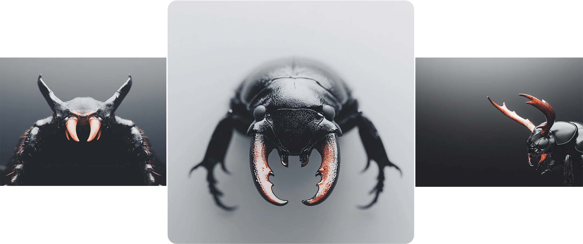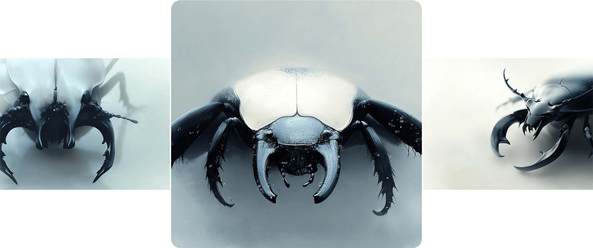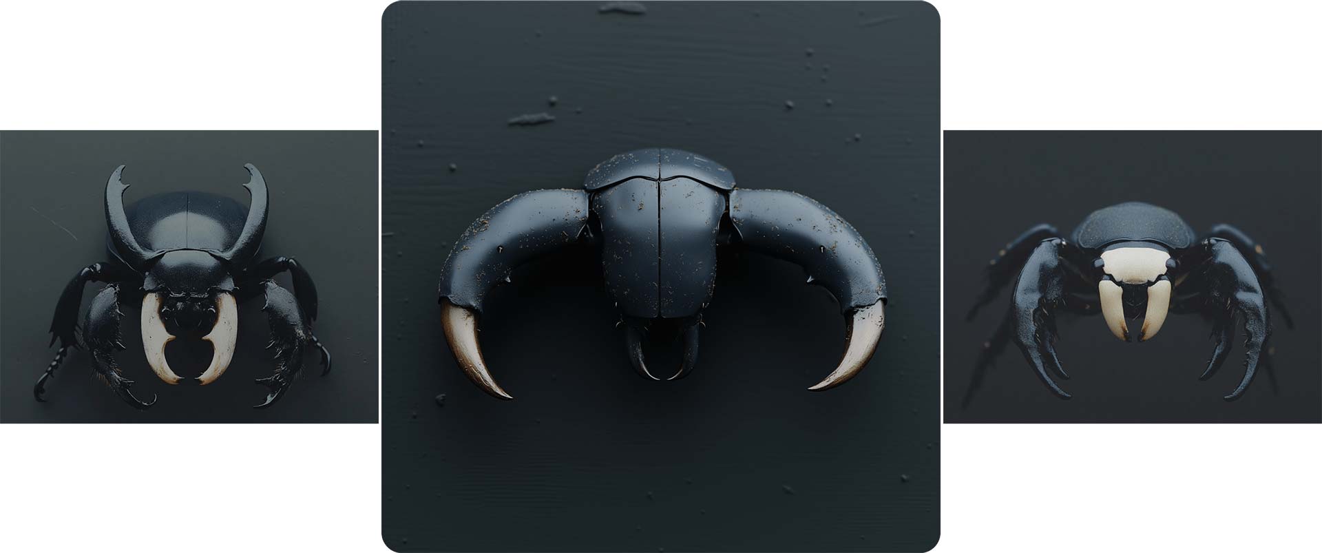Die Käfer sind kantig und kräftig geformt, ihre Körper wirken massiv und widerstandsfähig. Die Struktur ist geometrisch und symmetrisch, wobei besonders die geschwungenen Hörner und Klauen ins Auge fallen. Diese betonen den Eindruck von Stärke und Verteidigungsbereitschaft, während die Frontansichten die kompakte und gedrungene Form der Käfer betonen.