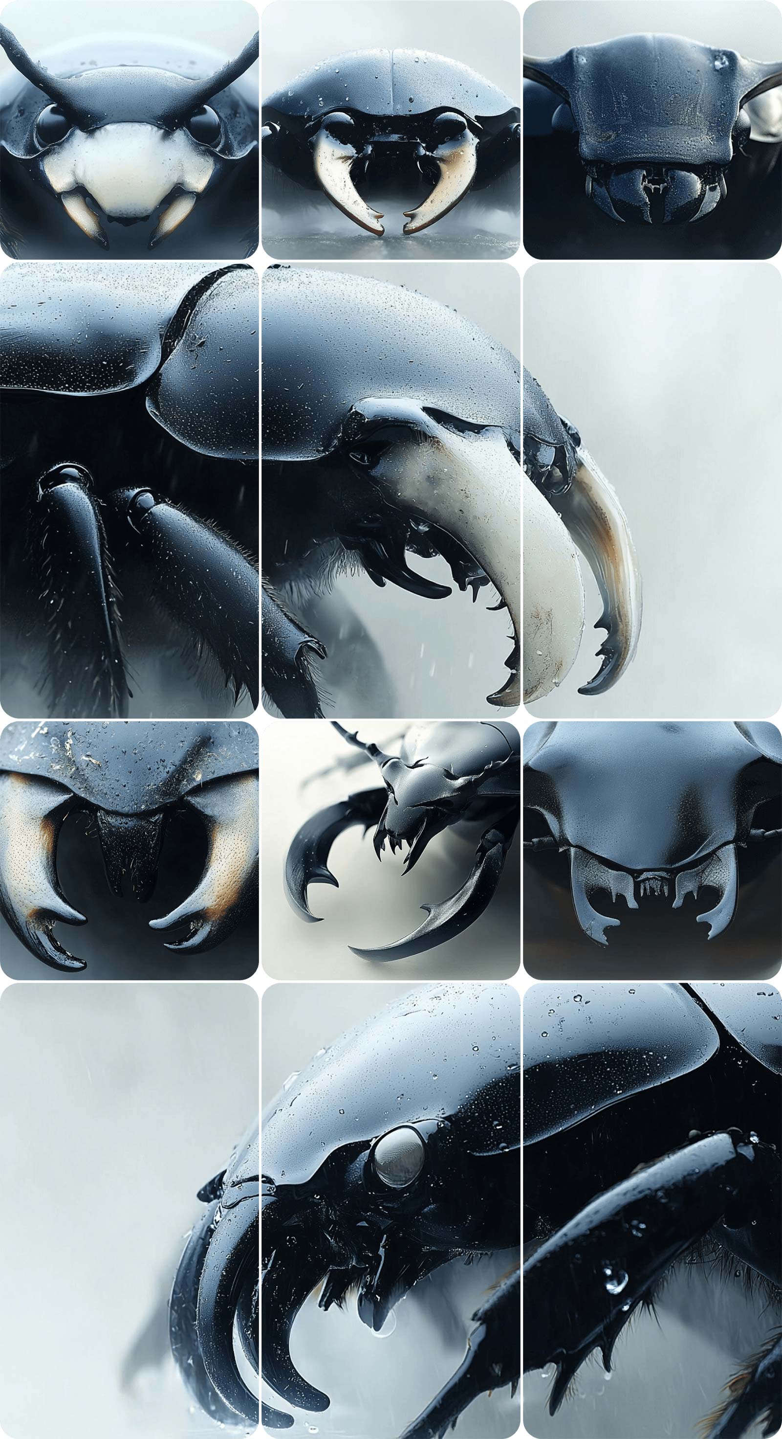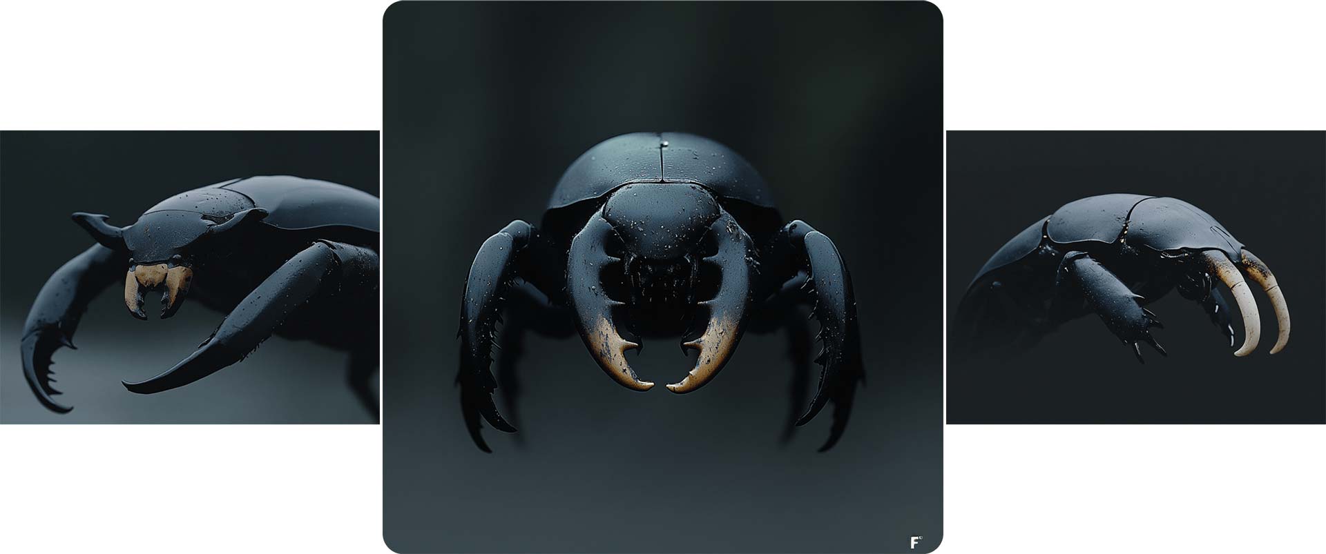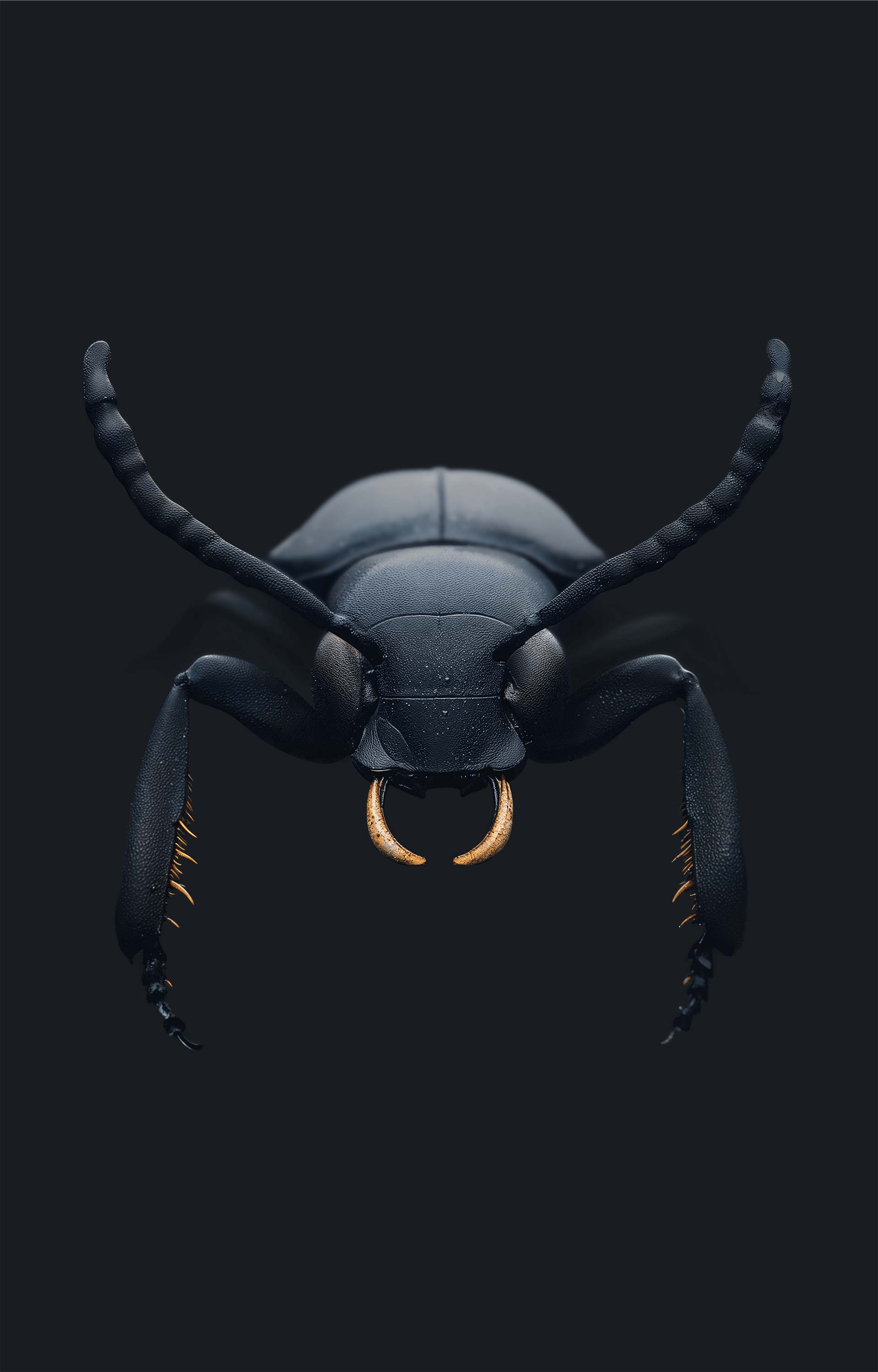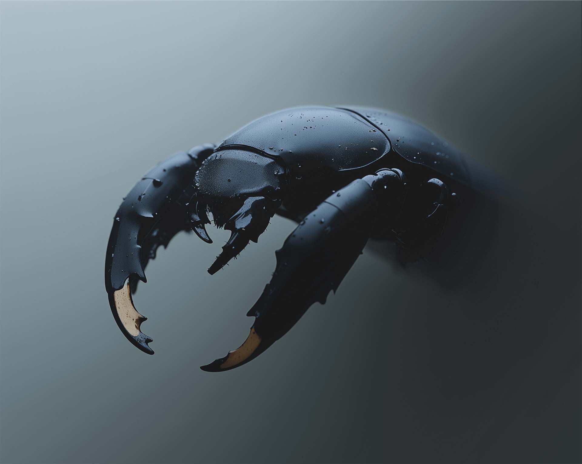 Die Farbgestaltung ist minimalistisch und konzentriert sich auf tiefes Schwarz und Dunkelgrau, das nur von wenigen blassen Akzenten durchbrochen wird. Diese wenigen, elfenbeinfarbenen Akzente in den Klauen und Mandibeln geben den Käfern einen Hauch von Eleganz und Erhabenheit.
