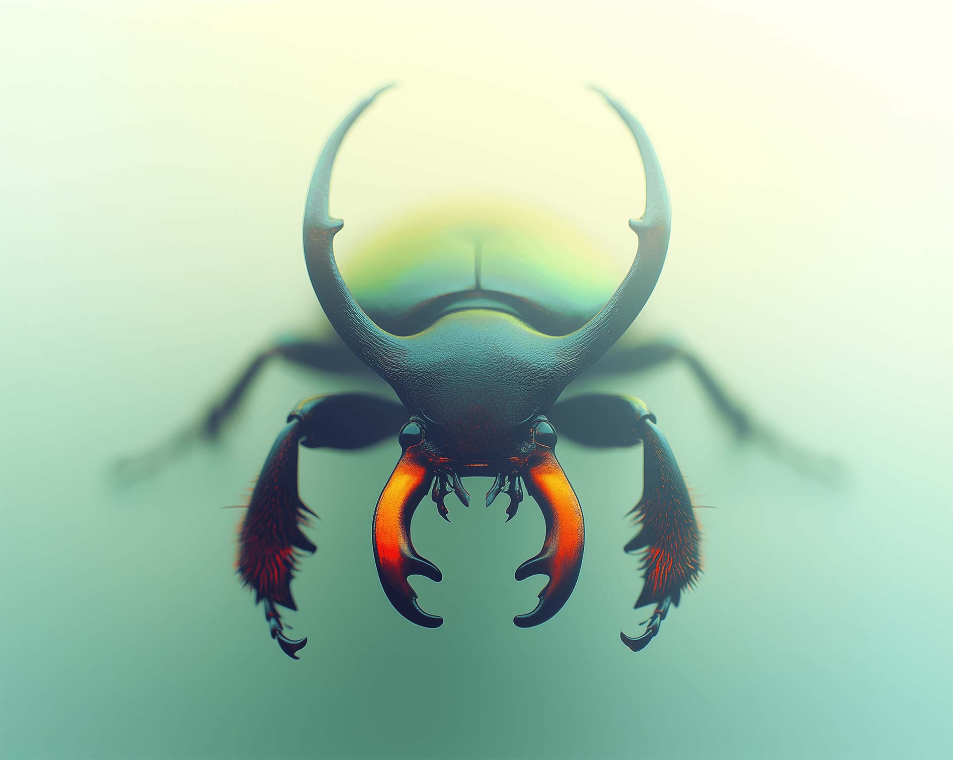 Die Oberfläche der Käfer wirkt weich und leicht samtig, was sich von der üblichen, glänzenden Darstellungsweise abhebt. Diese matte, fast samtige Beschaffenheit erzeugt einen Eindruck von Weichheit und verleiht den Käfern eine fast greifbare, beruhigende Textur. Es entsteht der Eindruck, als wären sie mit einer feinen Schicht von Nebel oder Dunst überzogen, was ihre mystische Präsenz unterstreicht.