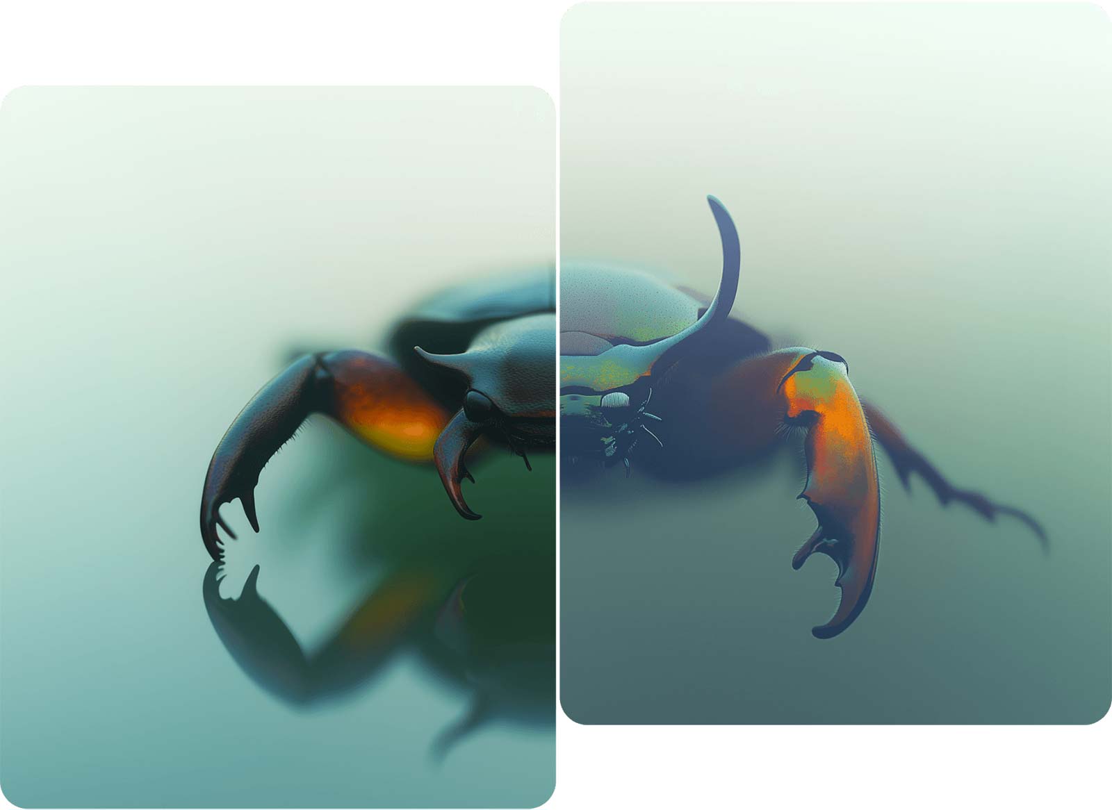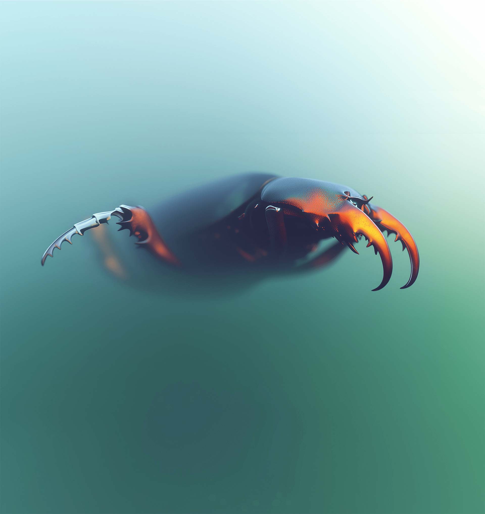 Die Farbgestaltung der Käfer ist außergewöhnlich: dunkle, fast samtige Körper, die von warmen, leuchtenden Orangetönen in Hörnern und Klauen akzentuiert werden. Diese warme Färbung verstärkt das Gefühl, als würden die Käfer von innen heraus glühen.