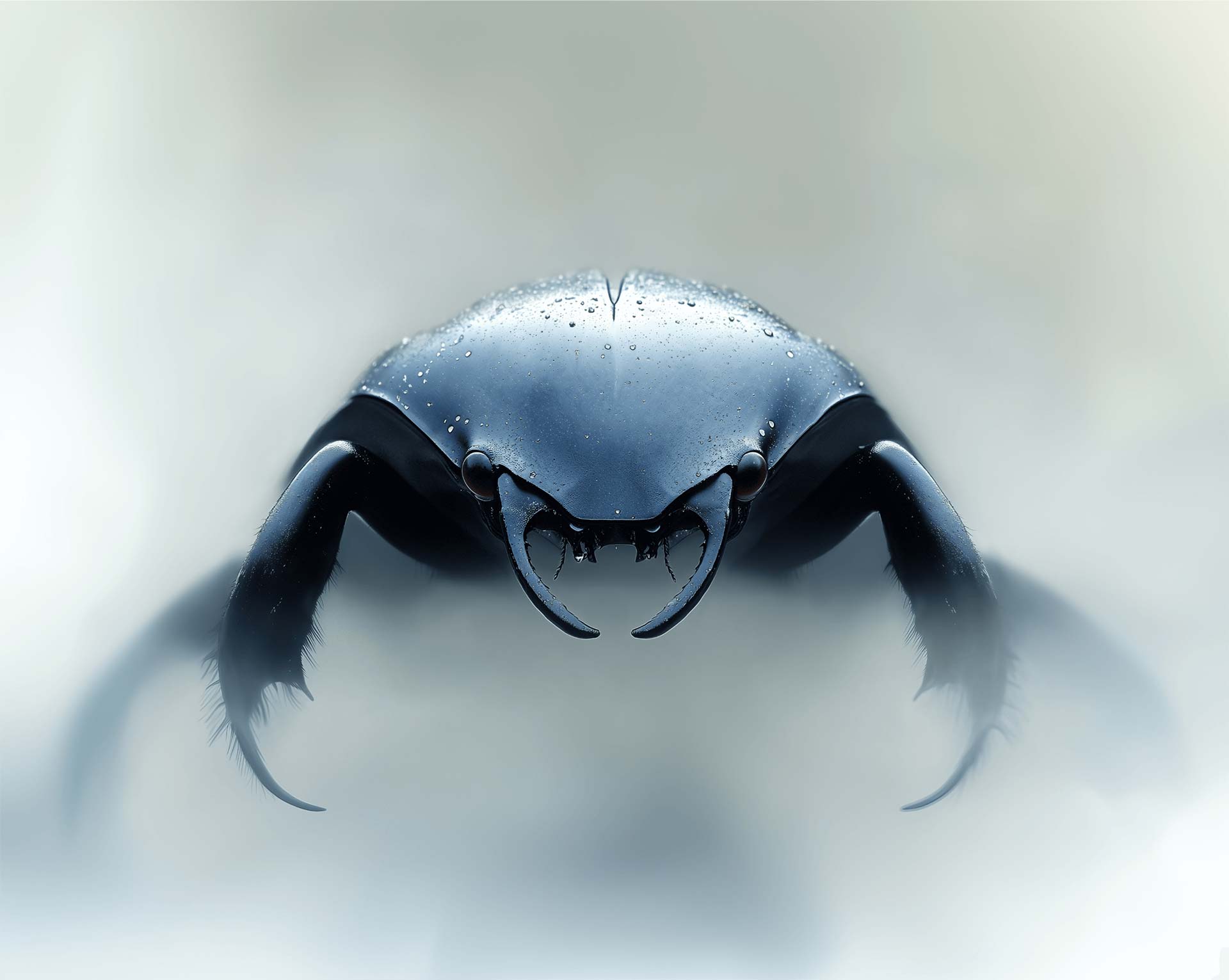 Die Farbpalette der Käfer besteht hauptsächlich aus tiefen Schwarz- und Blautönen, die mit elfenbeinfarbenen Akzenten in den Klauen und an den Mundwerkzeugen kontrastieren. Diese gedeckten Farben harmonieren mit dem Nebel, der sie umgibt, und lassen die Käfer fast wie Schattenwesen erscheinen. Die hellen Akzente verleihen ihnen eine feine, edle Note und schaffen einen subtilen visuellen Kontrast, der das Auge des Betrachters auf die Details lenkt.