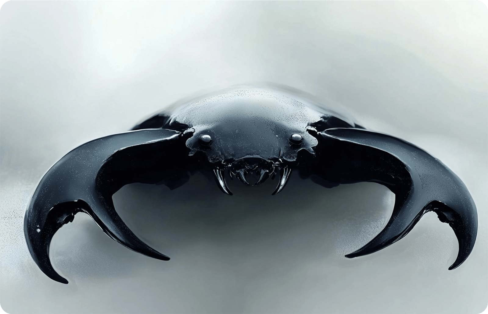 Das Stil 470043244 verleiht den Darstellungen der Käfer eine düstere und zugleich faszinierende Ruhe. Die Farbpalette ist überwiegend dunkel, reduziert auf ein tiefes, gedämpftes Schwarz und Dunkelgrau, das gelegentlich durch blasse, fast elfenbeinfarbene Akzente in den Käferklauen aufgebrochen wird. Die kühlen, monochromen Farben verstärken den Eindruck einer mystischen und geheimnisvollen Atmosphäre, die den Käfern etwas Fremdartiges verleiht. Der Stil gibt dem Bild eine nüchterne Präzision.