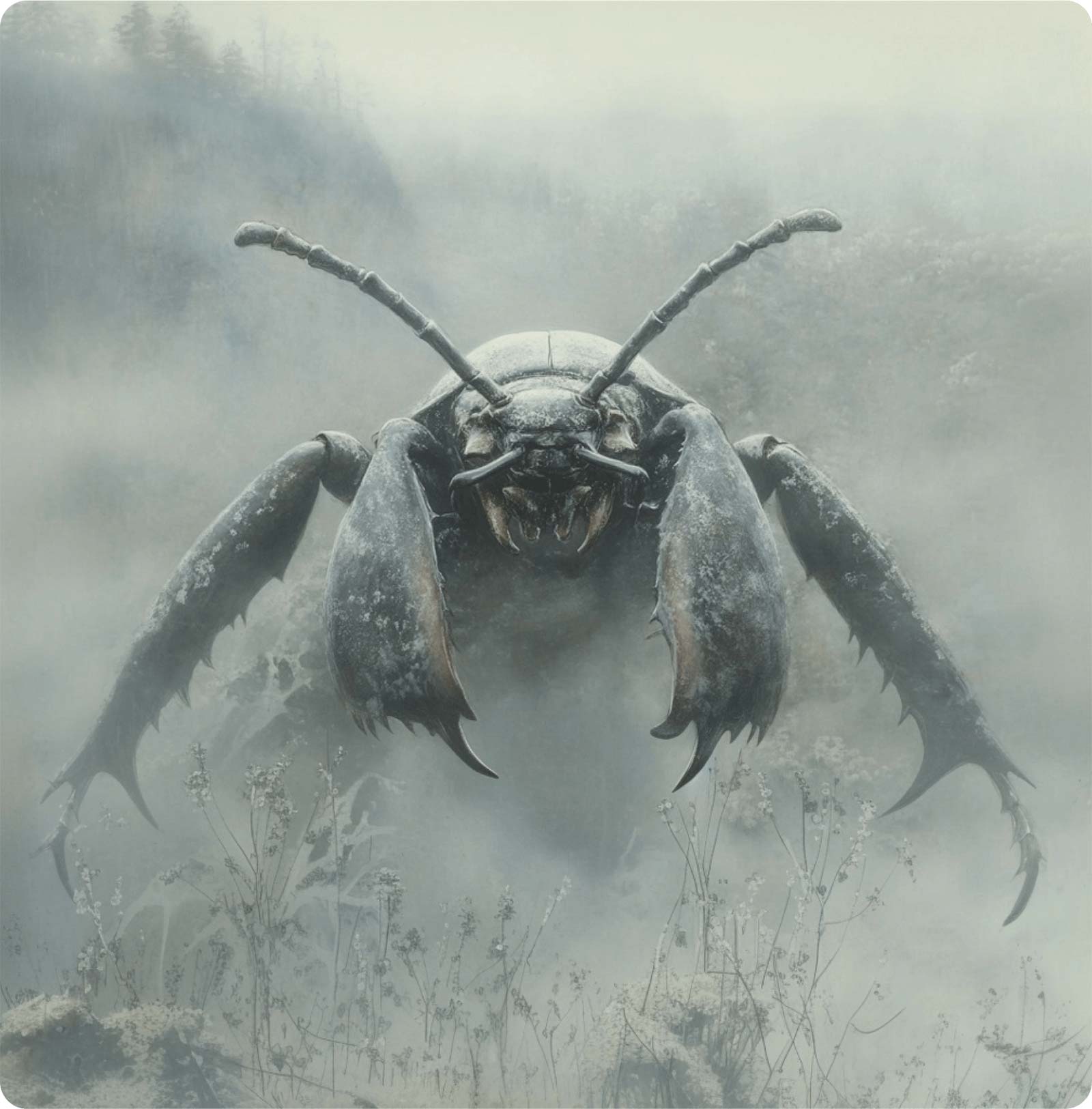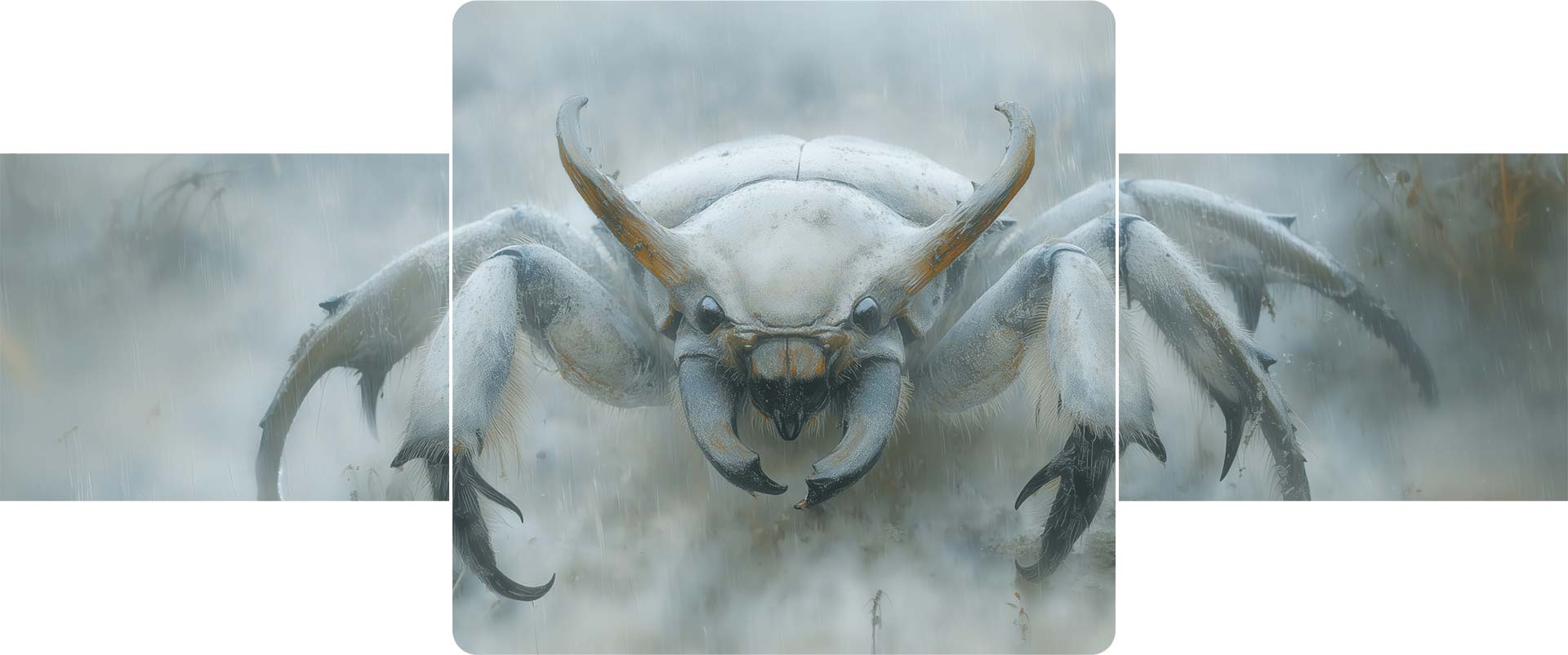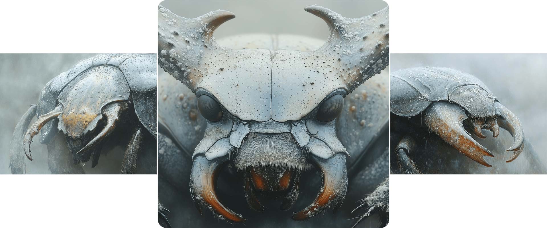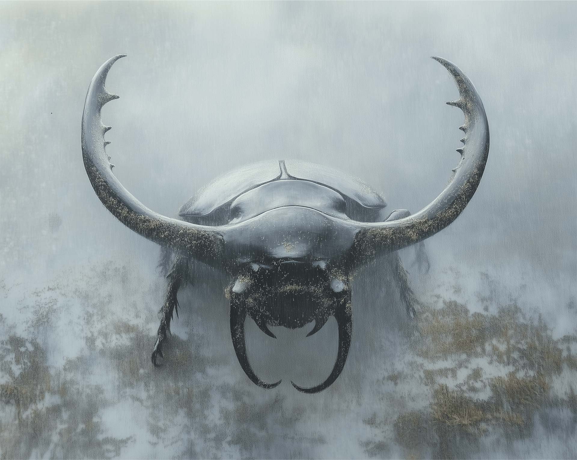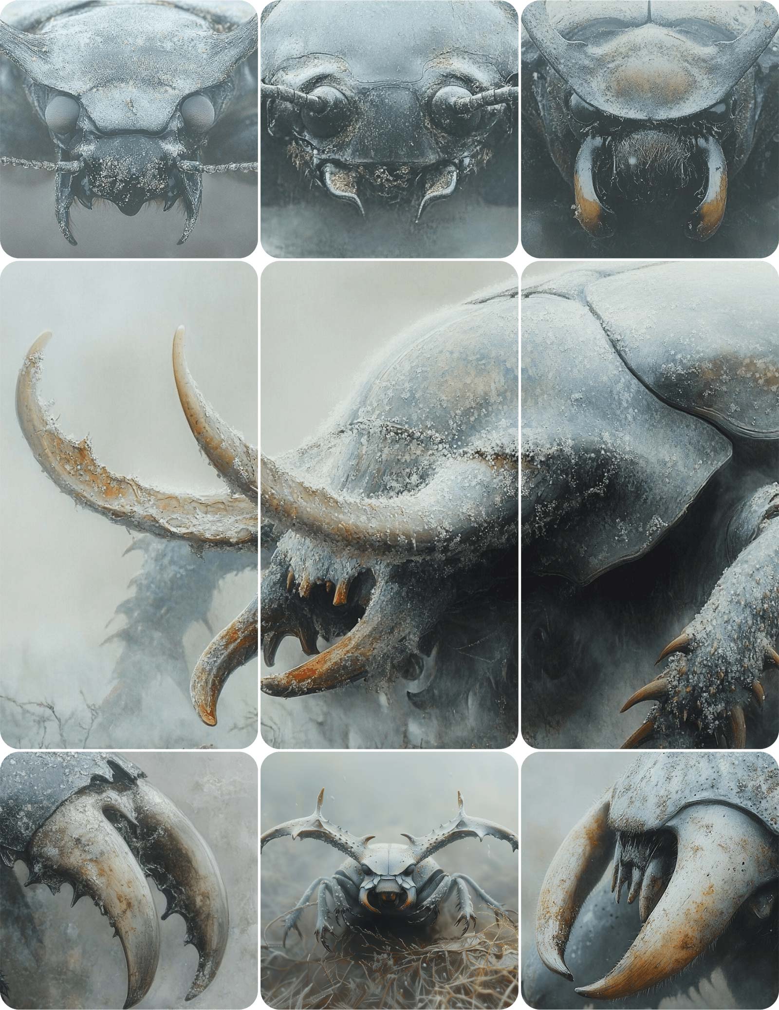 Der Stil 338574977 vermittelt eine kühle, melancholische Stimmung, die durch die sanften Grau- und Blautöne unterstützt wird. Die Käfer erscheinen wie in einem feinen Nebel gefangen, umhüllt von einem diffusen Licht, das ihre Konturen weicher und geheimnisvoller erscheinen lässt. Das Farbklima ist zurückhaltend und wirkt beinahe frostig, mit vereinzelten Akzenten in Elfenbein- und Cremefarben, die sich in den Klauen und Mundwerkzeugen der Käfer wiederfinden. Die gedämpfte Farbgebung des Stils verleiht dem Bild eine fragile, poetische Qualität.